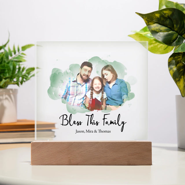 Acrylic Square Plaque, Bless the Family, Customize with your family picture - Battery Powered LED Base is backordered and will ship as soon as it is back in stock.