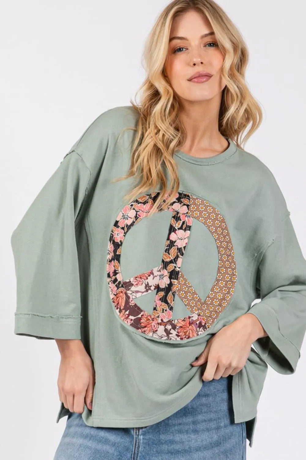 SAGE + FIG Floral Peace Patch Round Neck Top - Sage / S is backordered and will ship as soon as it is back in stock.