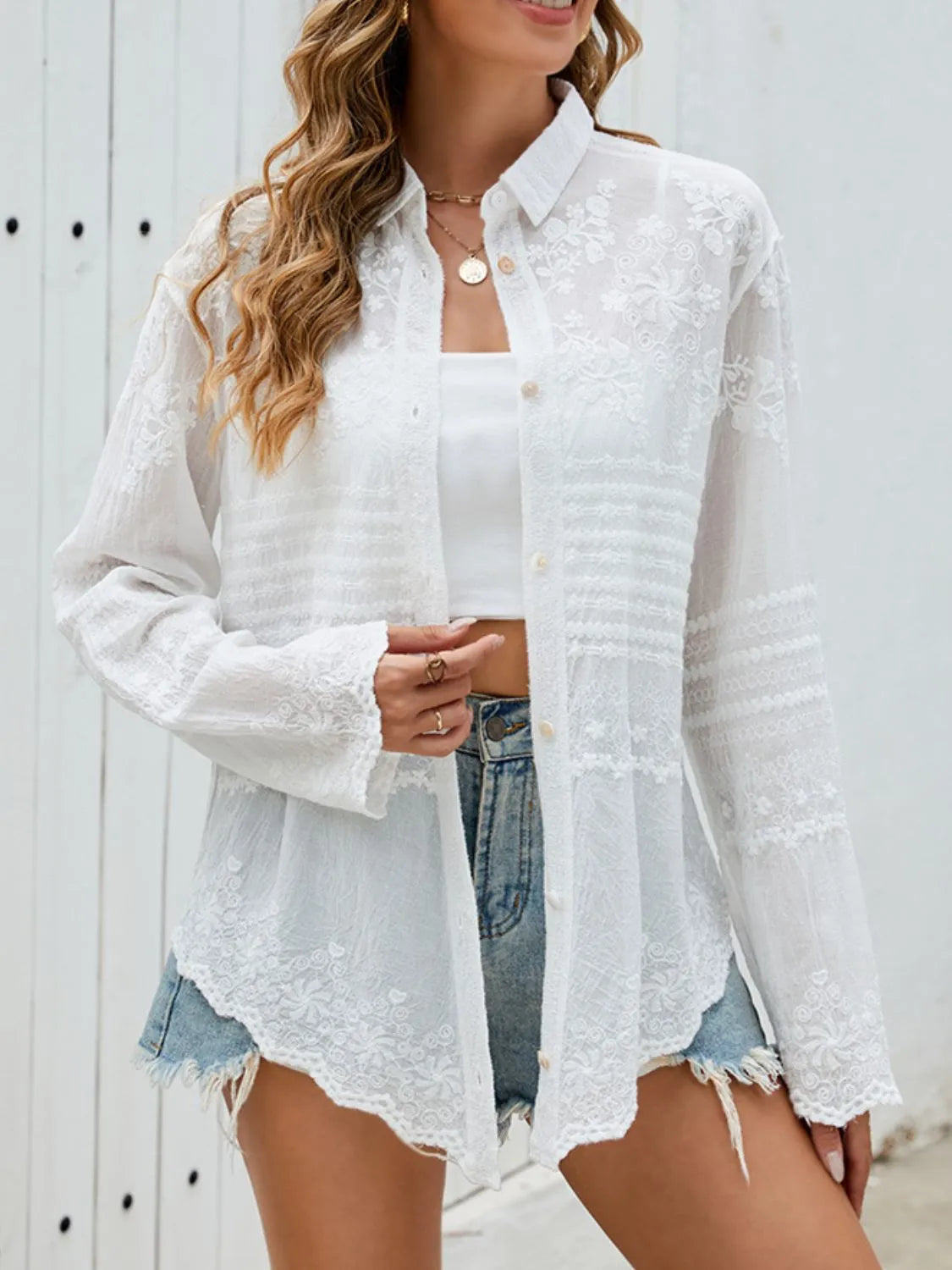 Button Down Collared Neck Long Sleeve Shirt - White / One Size is backordered and will ship as soon as it is back in stock.