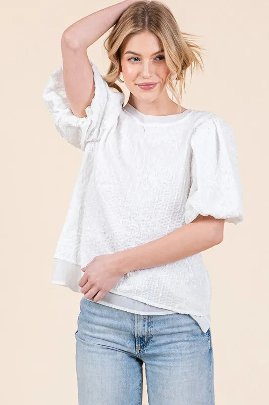 Add a touch of romantic charm to your outfit with this floral textured puff sleeve top. The floral detailing gives it a feminine and elegant look. The puff sleeves add a stylish and eye-catching element. Perfect for dressing up a casual outfit or adding flair to a work ensemble. Pair with jeans or a skirt for a versatile and chic look. Embrace a trendy and sophisticated style with this gorgeous top.