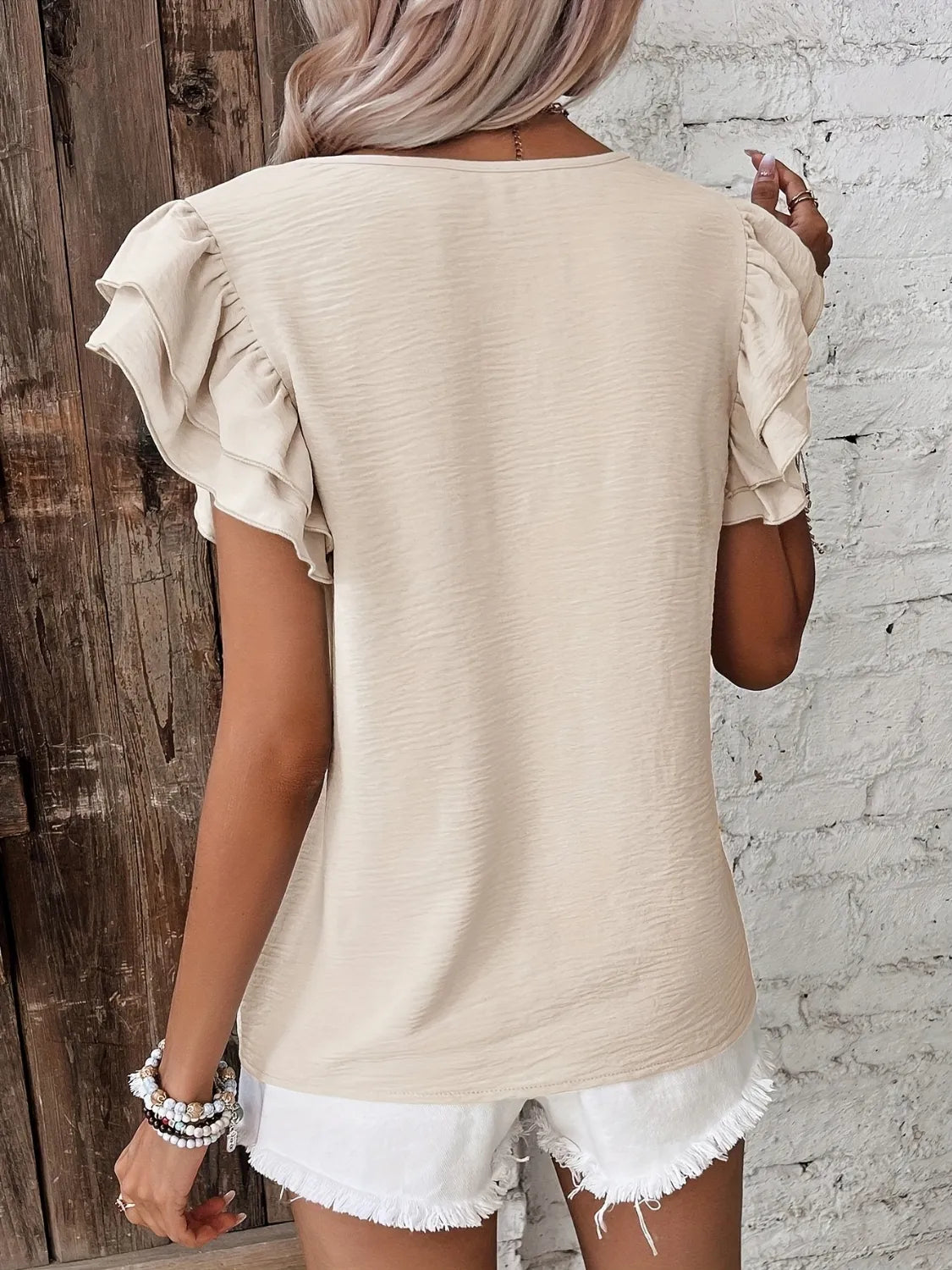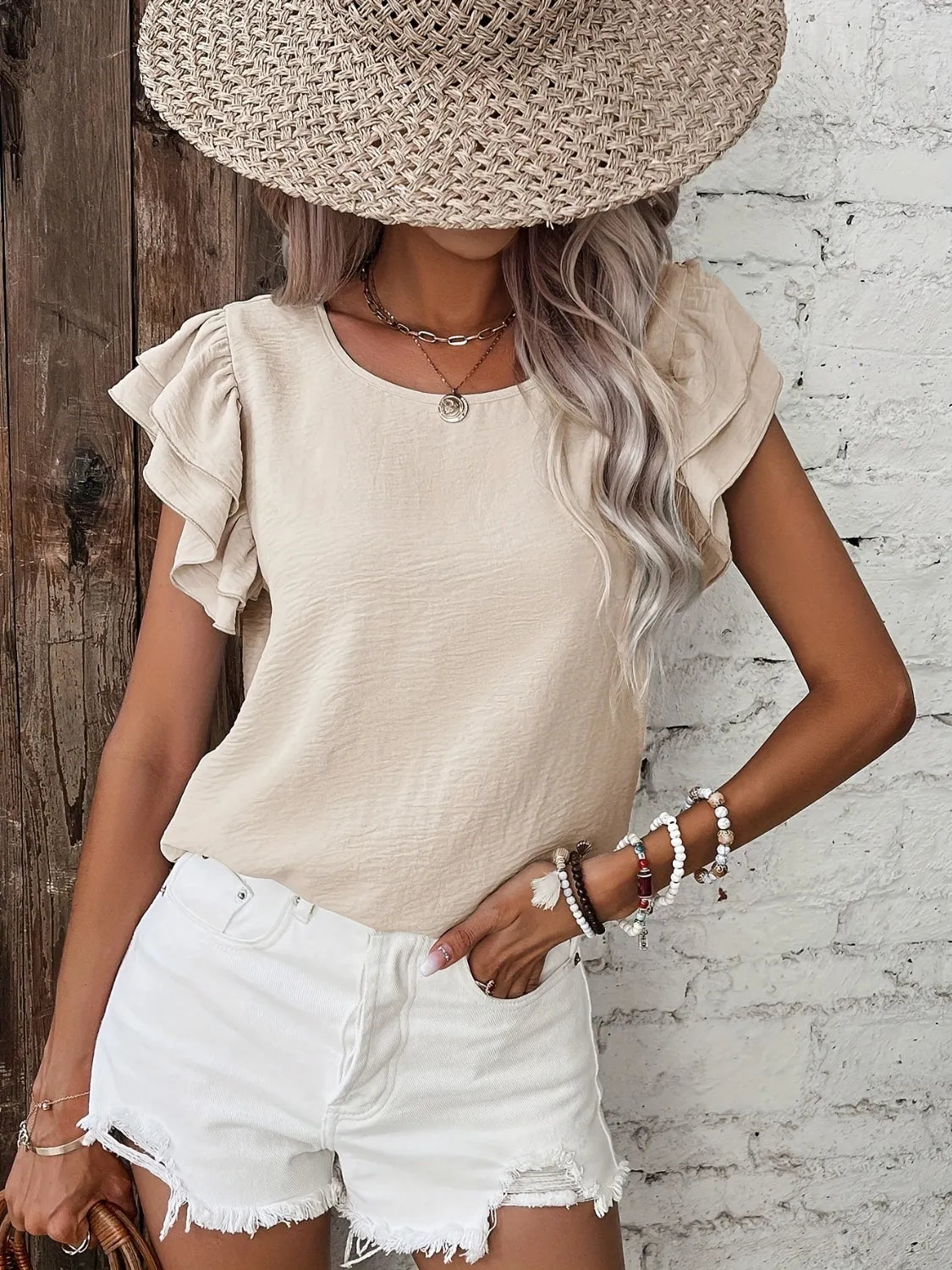 Ruffled Round Neck Cap Sleeve Blouse - Dust Storm / S is backordered and will ship as soon as it is back in stock.