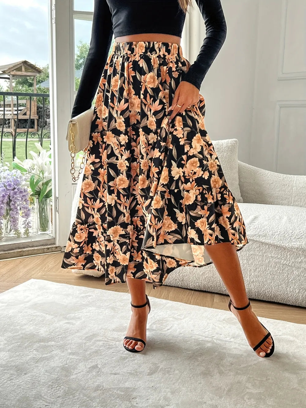 Floral Elastic Waist Midi Skirt - Sherbet / S is backordered and will ship as soon as it is back in stock.