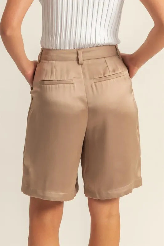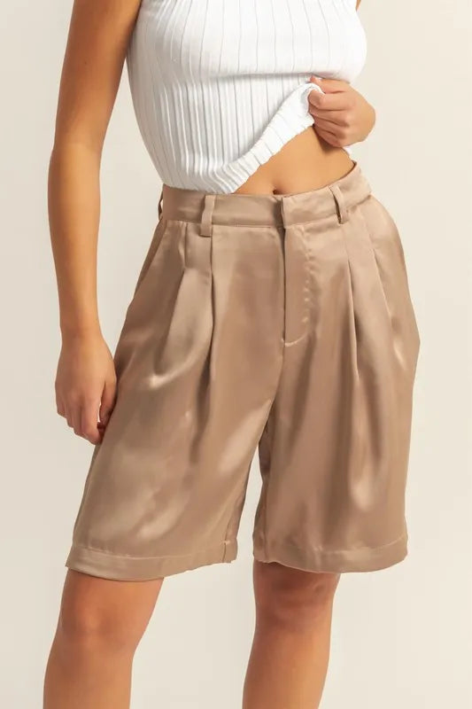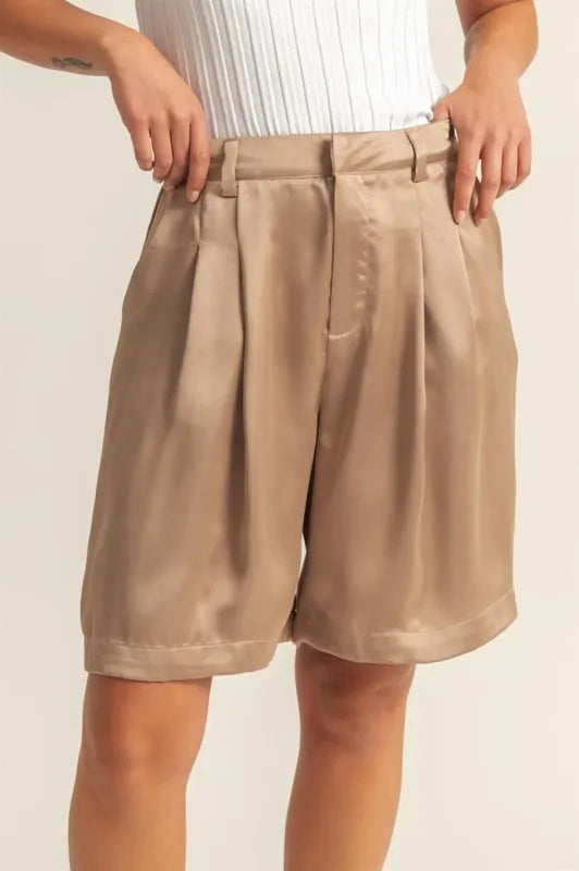 The High-Waist Pleated Satin Shorts are a luxurious and chic addition to your wardrobe. Featuring a high waist design that accentuates the waistline, these shorts offer a flattering silhouette. The pleated satin fabric adds an elegant and sophisticated touch to the ensemble. These shorts are perfect for dressing up for a special occasion or adding a touch of glamour to a casual outfit. Pair them with a blouse or a crop top for a stylish and on-trend look that is sure to turn heads.
