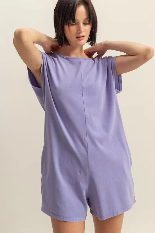 HYFVE Round Neck Cap Sleeve Relaxed Fit Breezy Romper - Lavender / S is backordered and will ship as soon as it is back in stock.