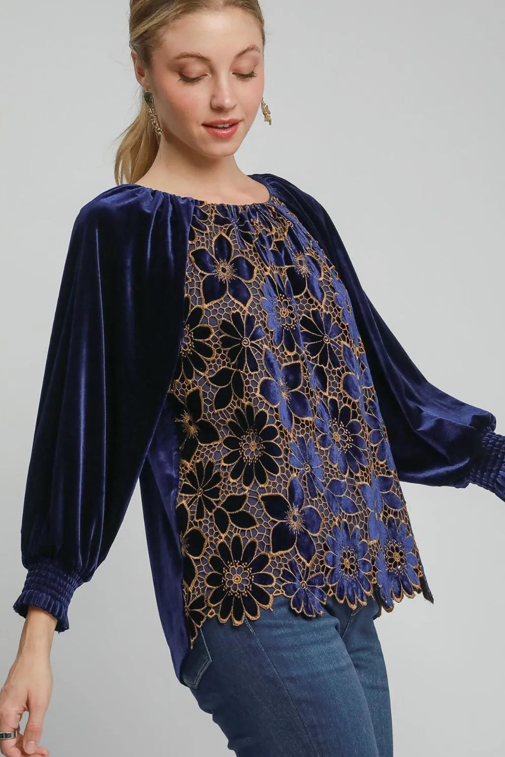 Umgee Full Size Floral Lace Velvet Raglan Sleeve Top Plus Size - Dark Blue / S is backordered and will ship as soon as it is back in stock.
