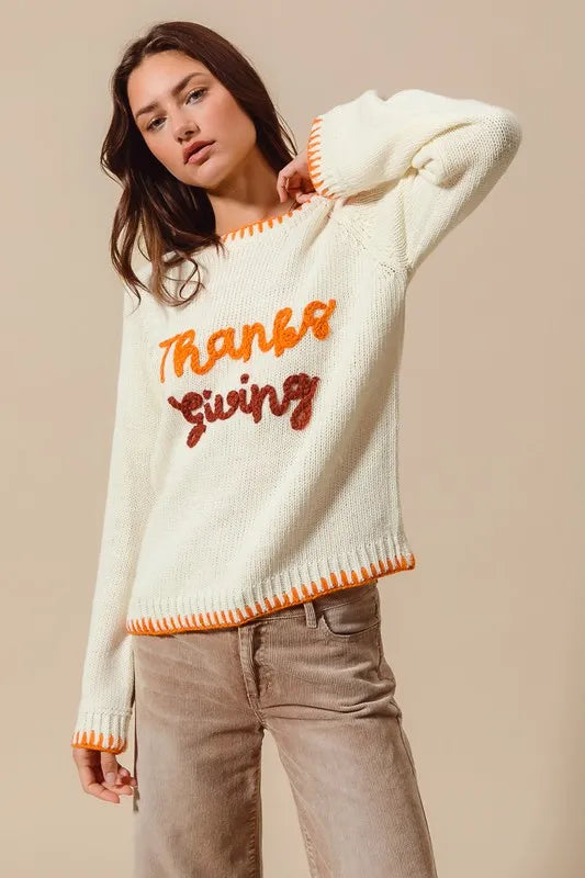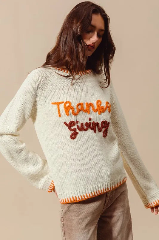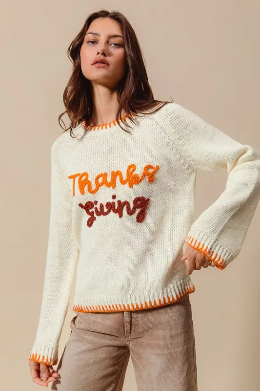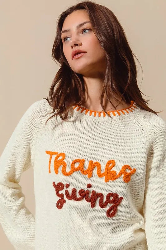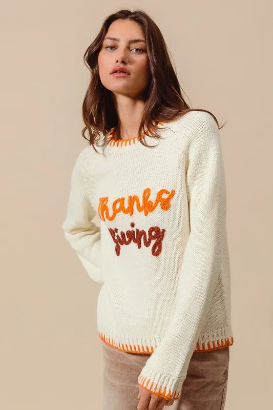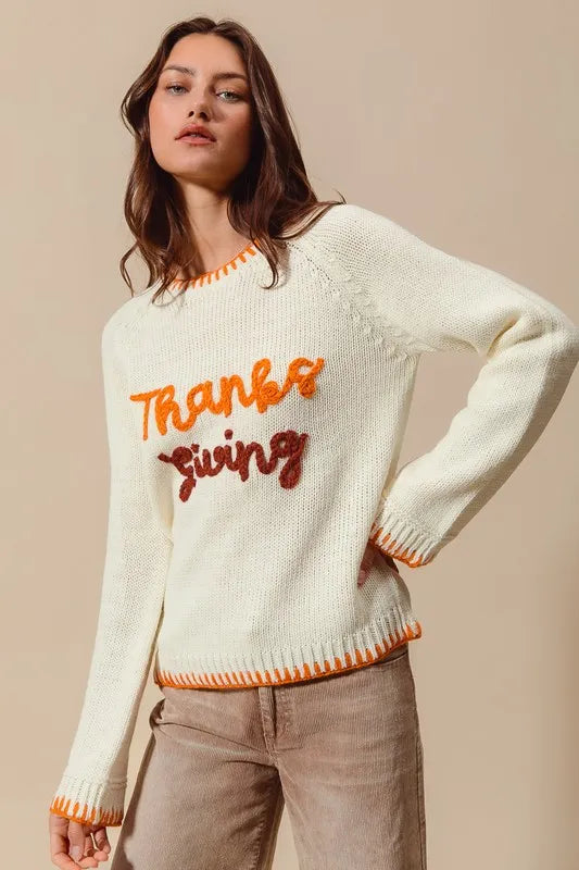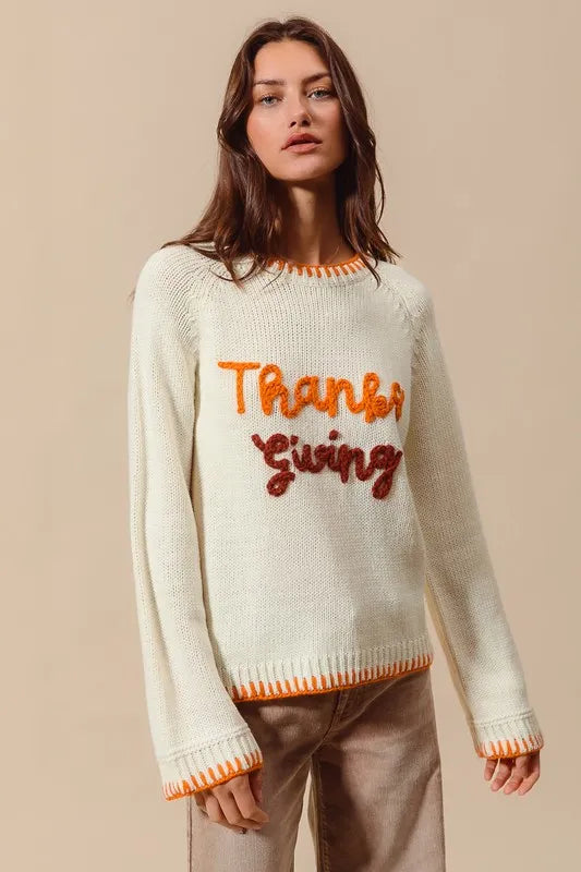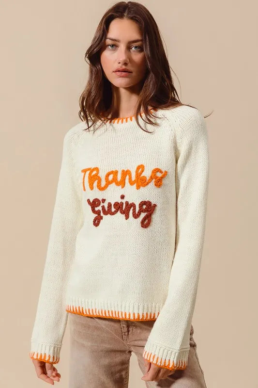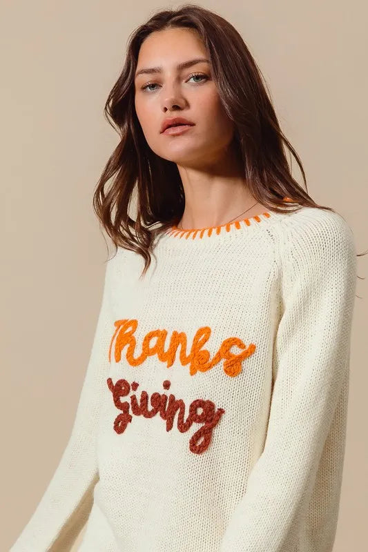 SO ME Thanksgiving Tinsel Lettering Sweater Top - IVORY / S is backordered and will ship as soon as it is back in stock.