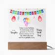 Your plaque will be crafted from premium acrylic with a professionally printed design for a polished look. It comes with a stylish wooden LED base, and you can choose between a USB plug-in option OR a cordless battery-operated option (requires 2 AAA batteries, not included). Both LED bases feature 7 vibrant colors, allowing the user to customize the lighting with various color changes and dynamic cycles.