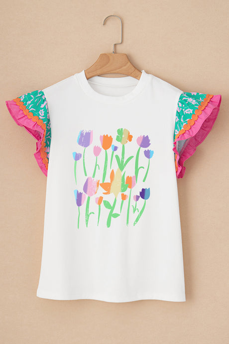 Ruffled Printed V-Neck Cap Sleeve Blouse
