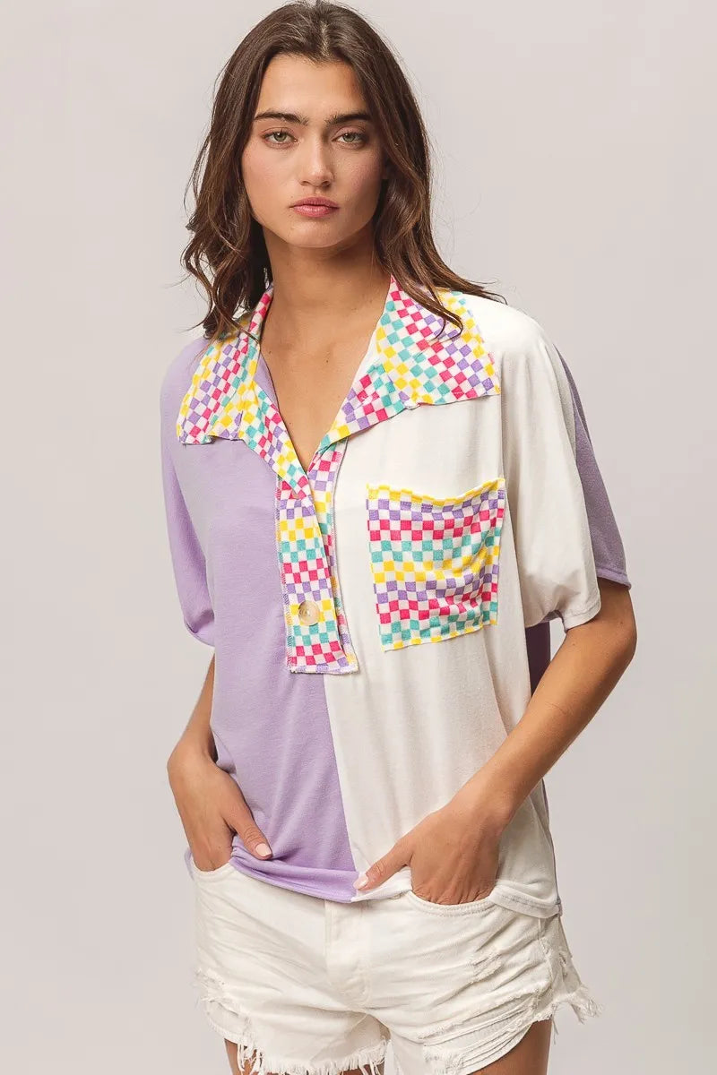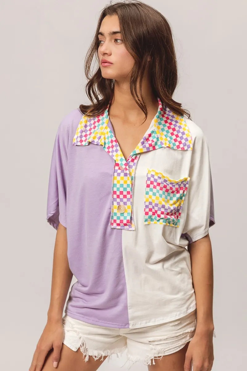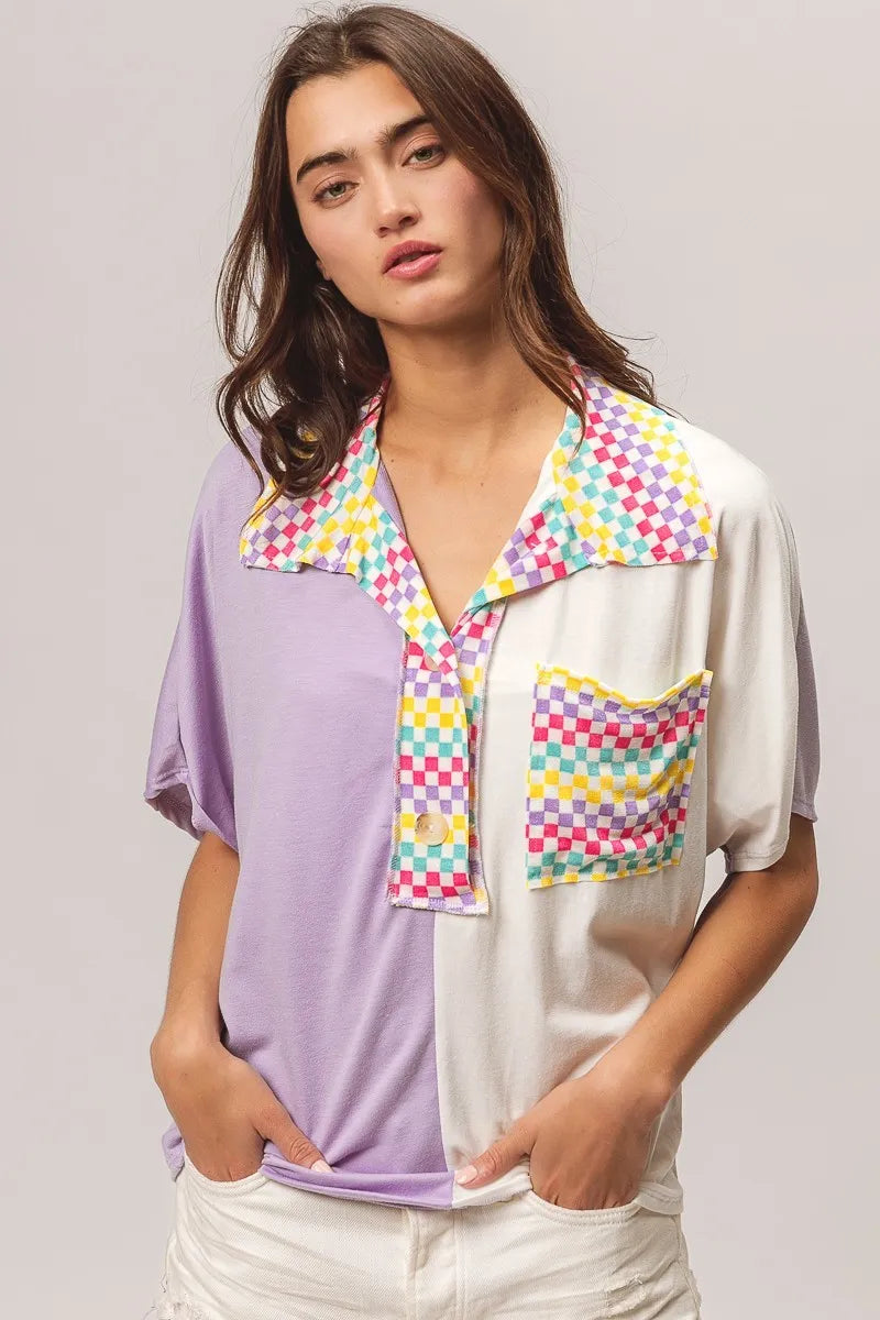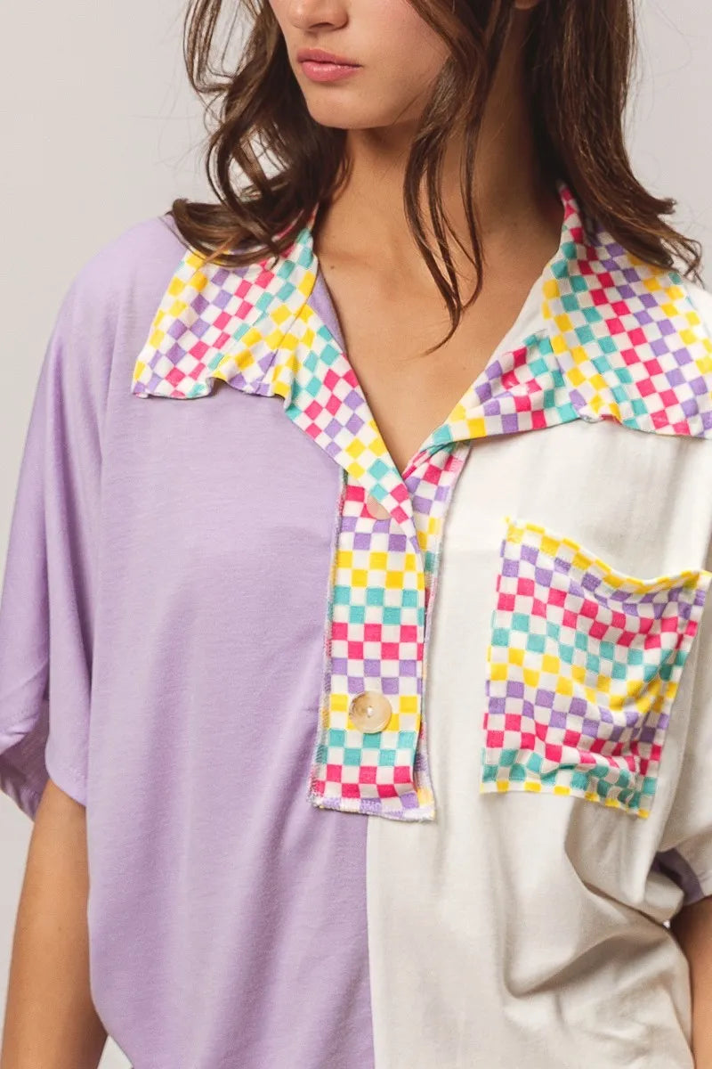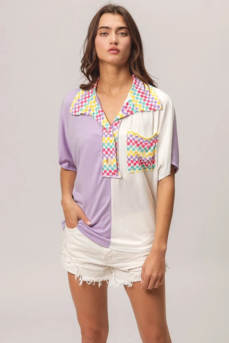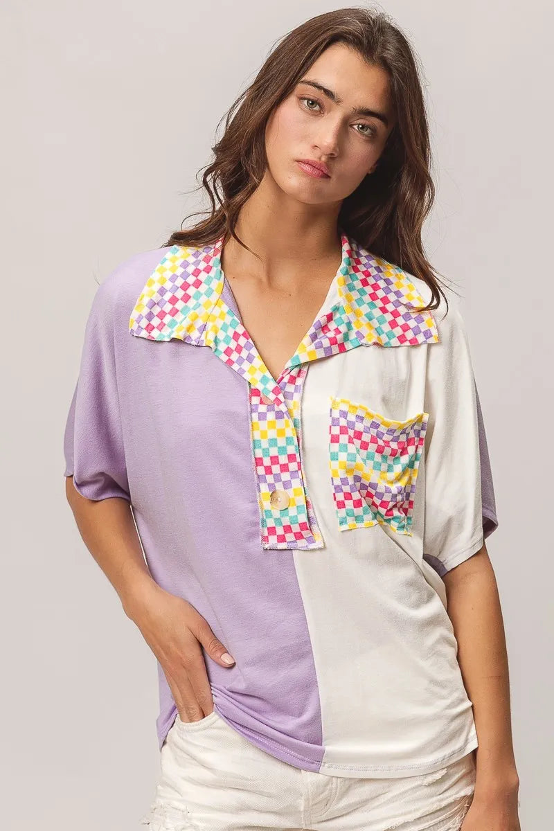 BiBi Color Block Knit with Multi Checker Contrast Top - LAVENDER / S está agotado y se enviará tan pronto como vuelva a estar disponible.