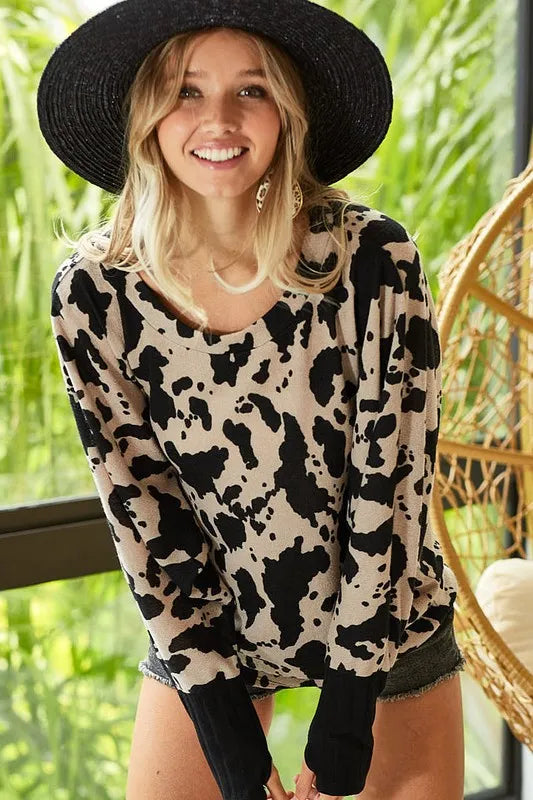 BiBi Dalmatian Print Knit Top With Thumb Opening Cuffs - TAUPE/BLACK / L está agotado y se enviará tan pronto como vuelva a estar disponible.