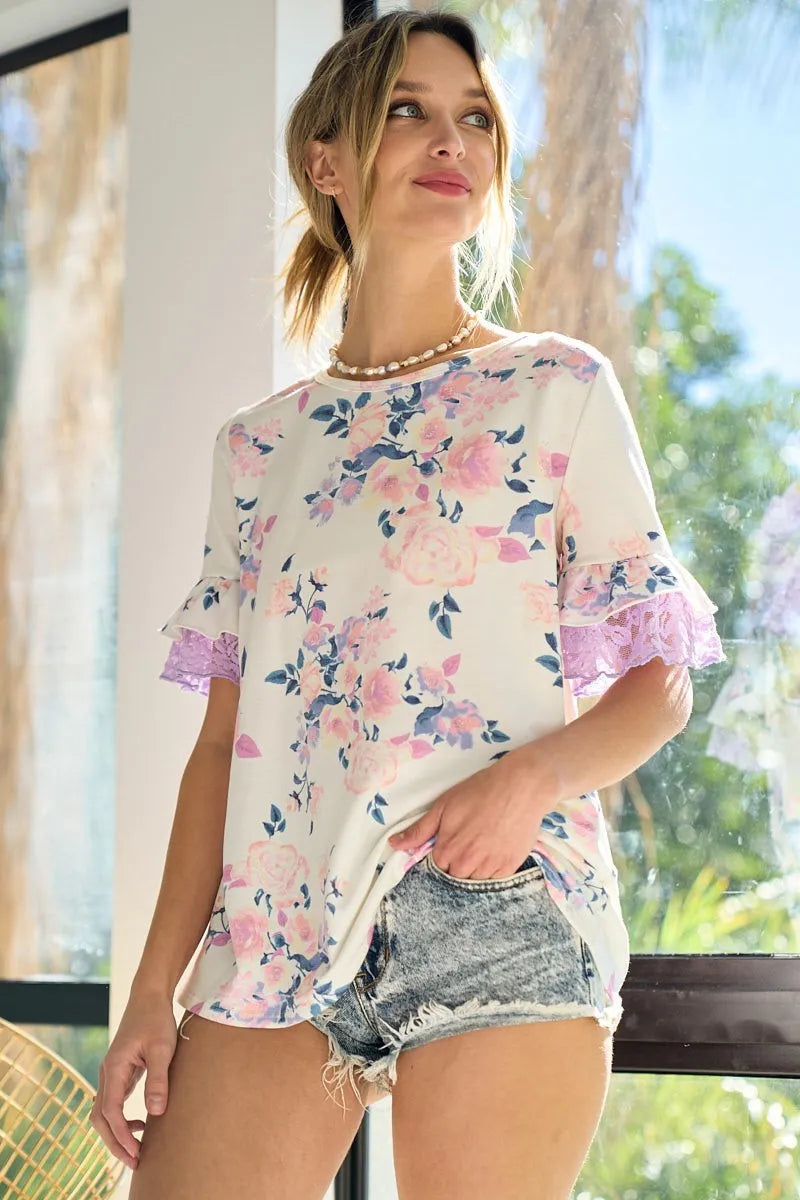 BiBi Floral Print French Terry with Lace Sleeve Top