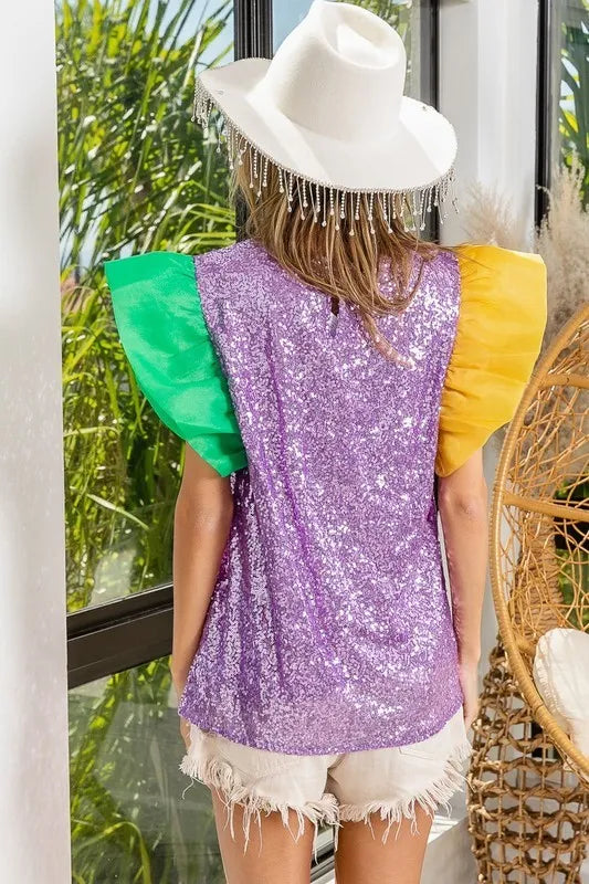 This top showcases a festive Mardi Gras color block design with organza sleeves and sequin embellishments for a glamorous and eye-catching look. Perfect for celebrating the carnival season or adding a touch of sparkle to your outfit, this top combines bold colors with elegant details for a statement-making ensemble. Ideal for special occasions or parties, this top is sure to stand out and make a stylish impression.