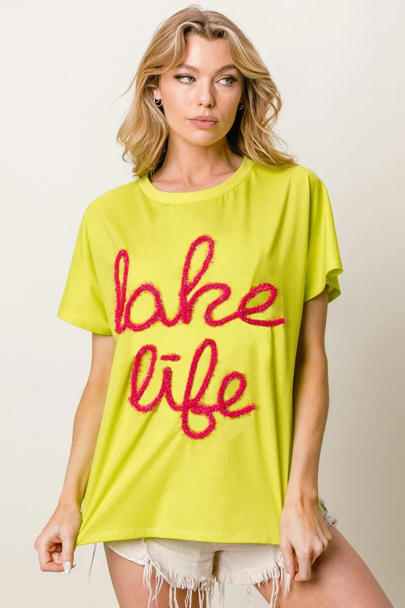 BiBi Metallic Letter Short Dolman Sleeve Top - NEON GREEN / S está agotado y se enviará tan pronto como vuelva a estar disponible.