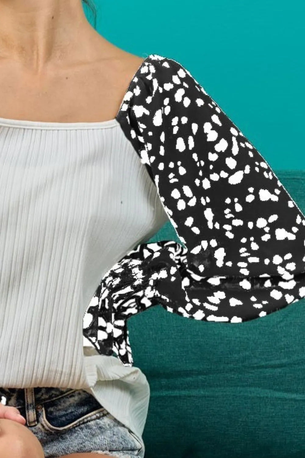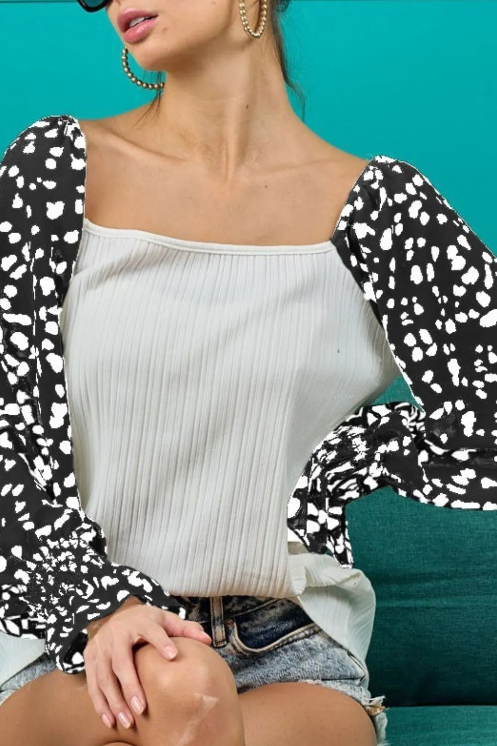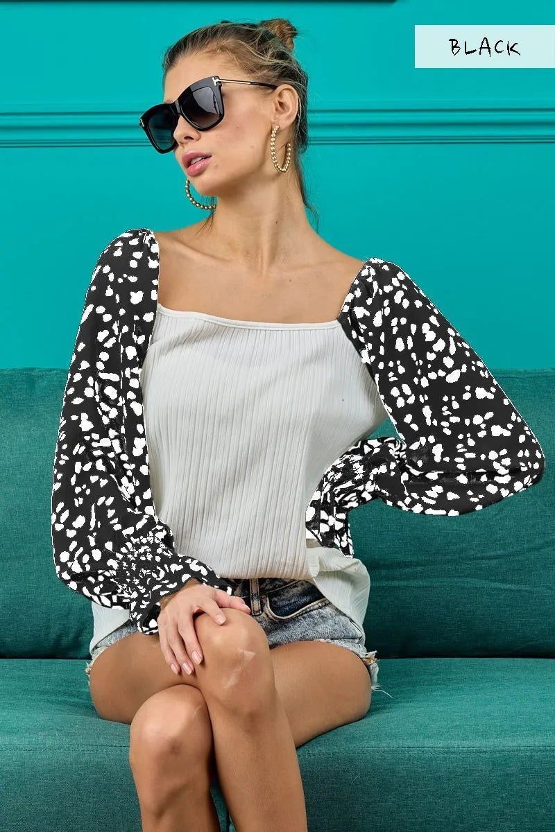 This ribbed top is designed with leopard printed long sleeves for a stylish and on-trend look. The ribbed texture adds depth and dimension to the top, while the leopard print sleeves provide a bold and eye-catching contrast. Made with high-quality fabric, this top offers both comfort and fashion-forward flair. Elevate your wardrobe with this chic and versatile top that effortlessly combines texture and print for a unique and modern outfit.