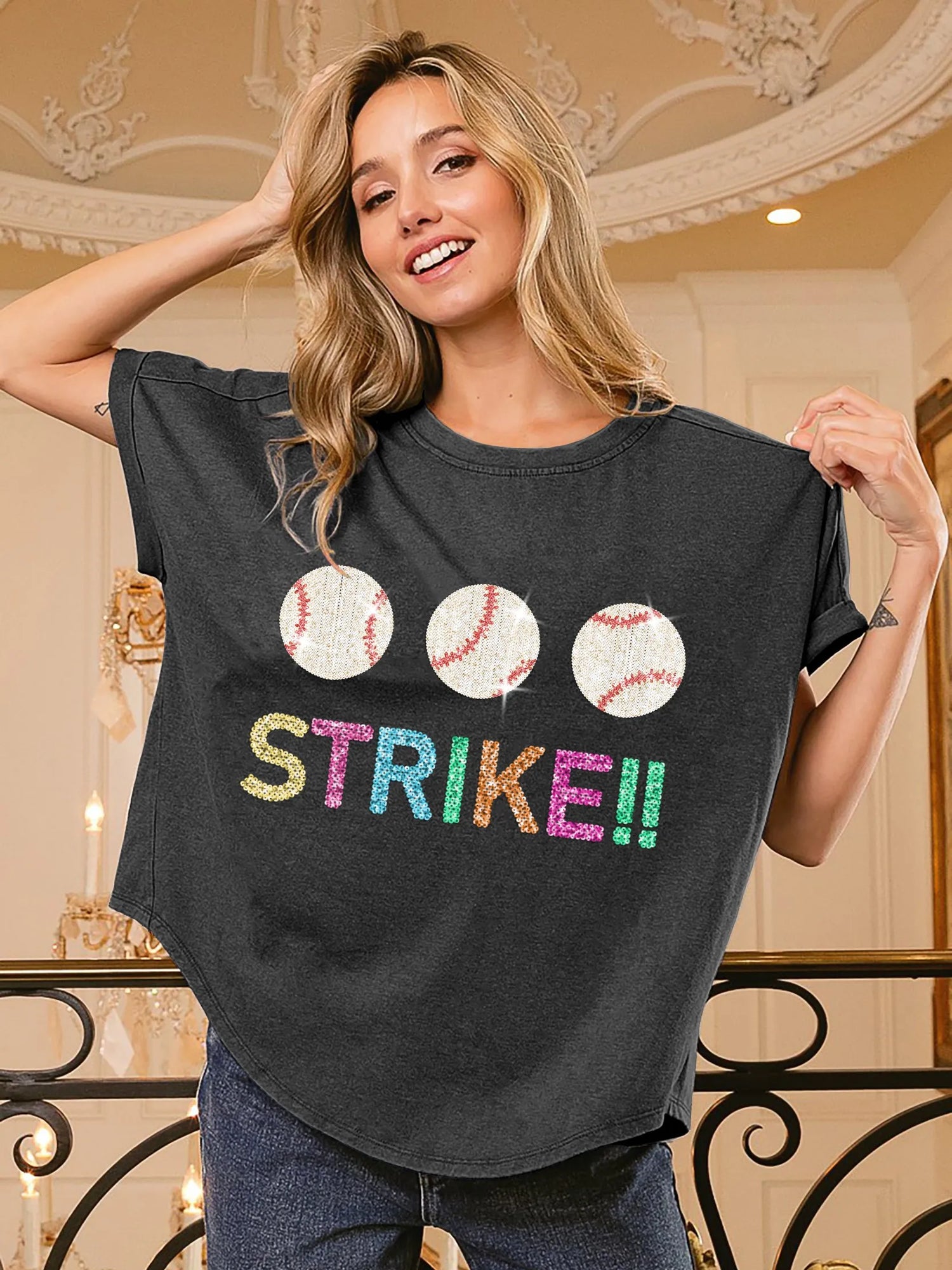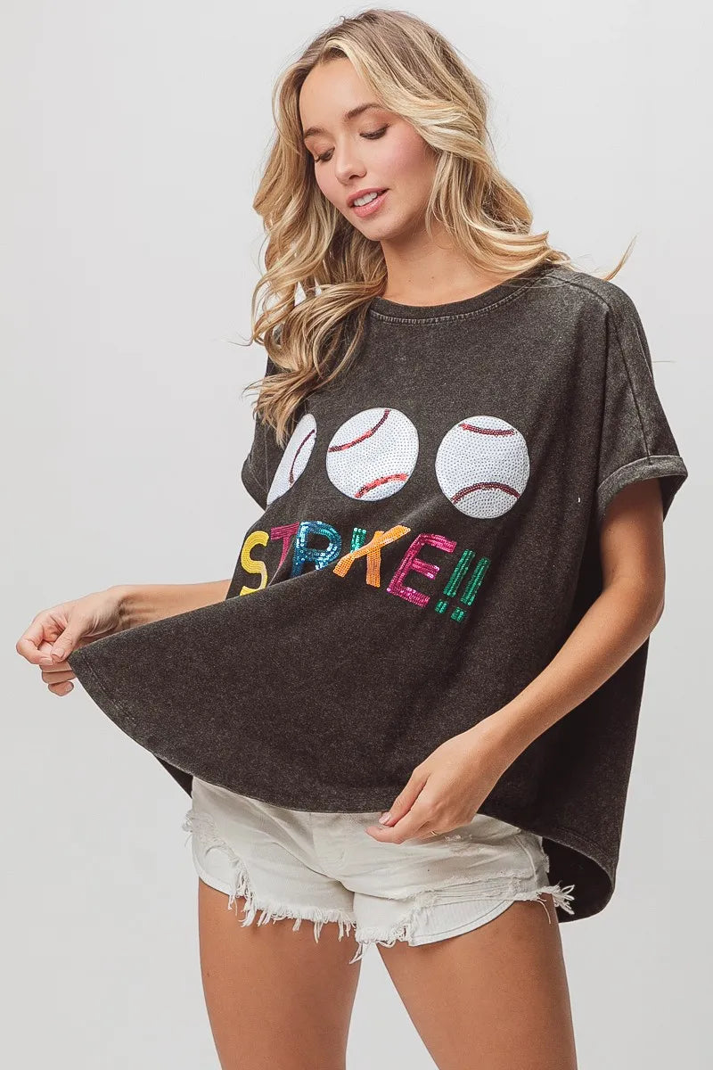BiBi Sequin Baseballs Strike Washed Short Sleeve Top