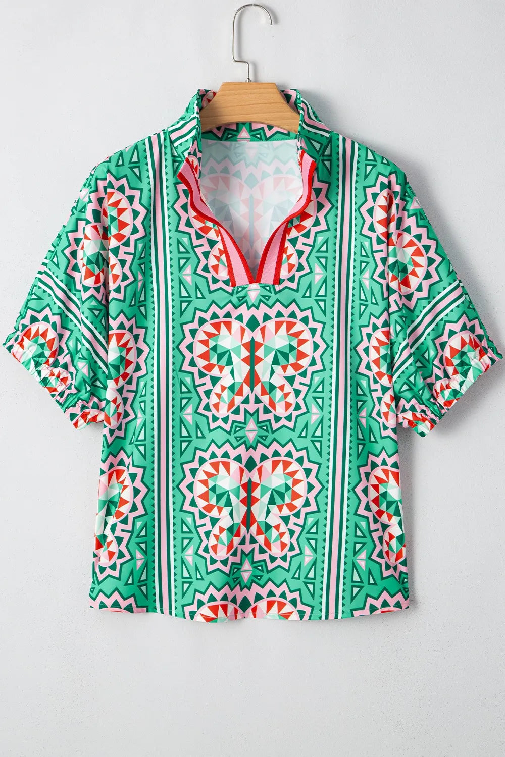 Boho Abstract Print Contrast Striped Collared V Neck Blouse