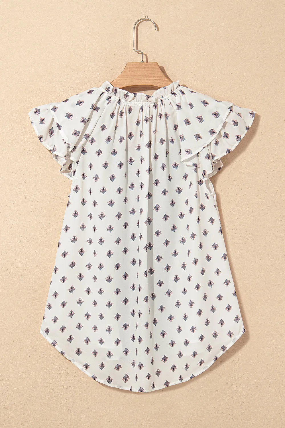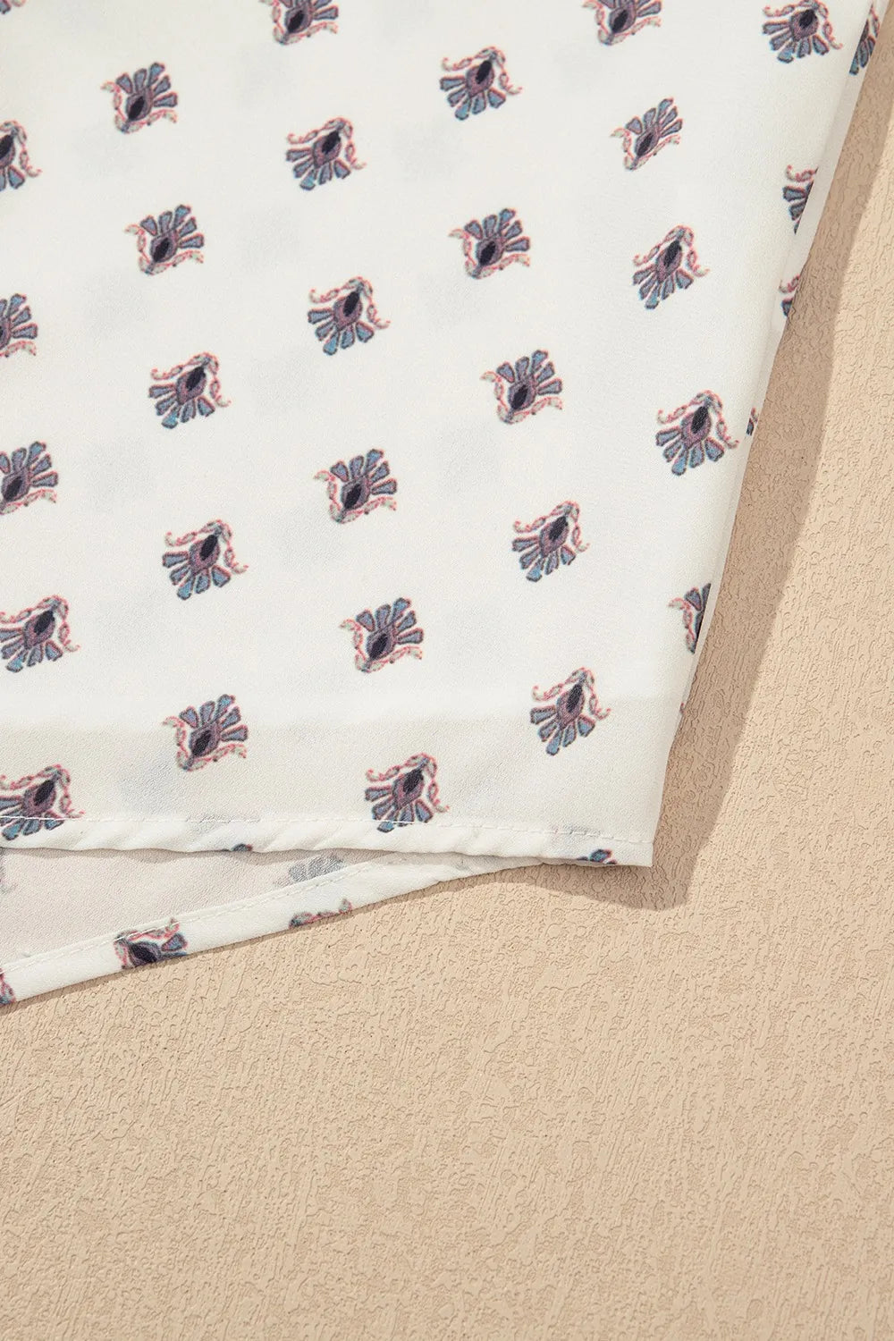 Boho Pattern Tiered Ruffled Sleeve V Neck Buttoned Blouse - White / S está agotado y se enviará tan pronto como vuelva a estar disponible.
