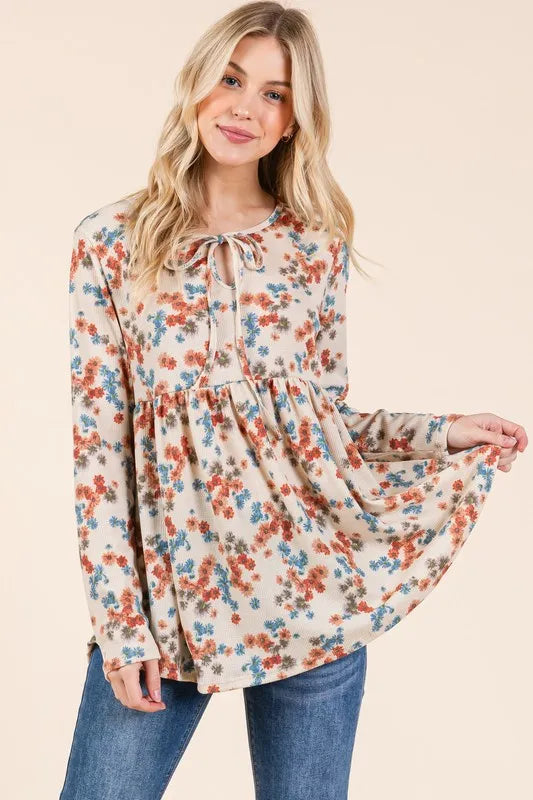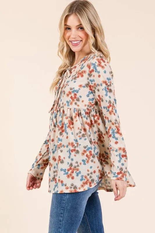BOMBOM Floral Print Tie Neck Long Sleeve Blouse