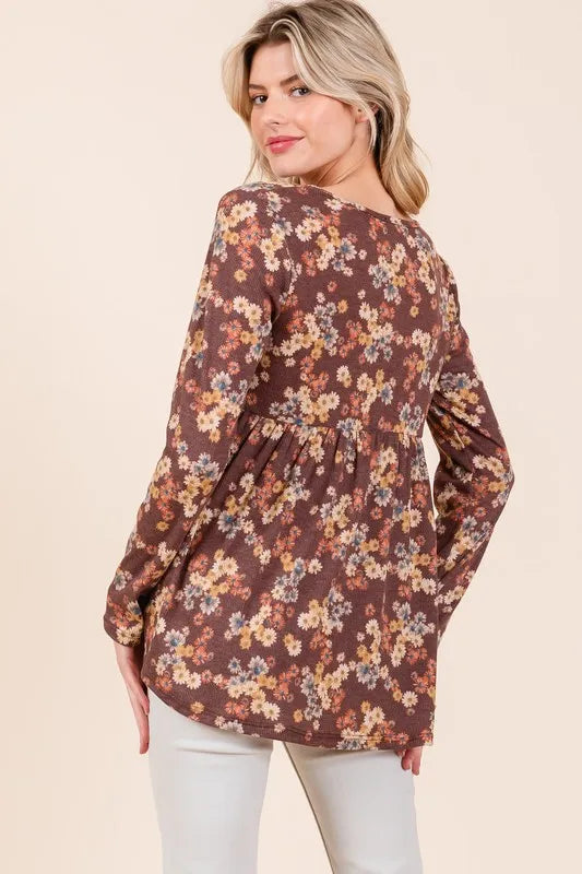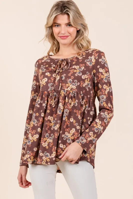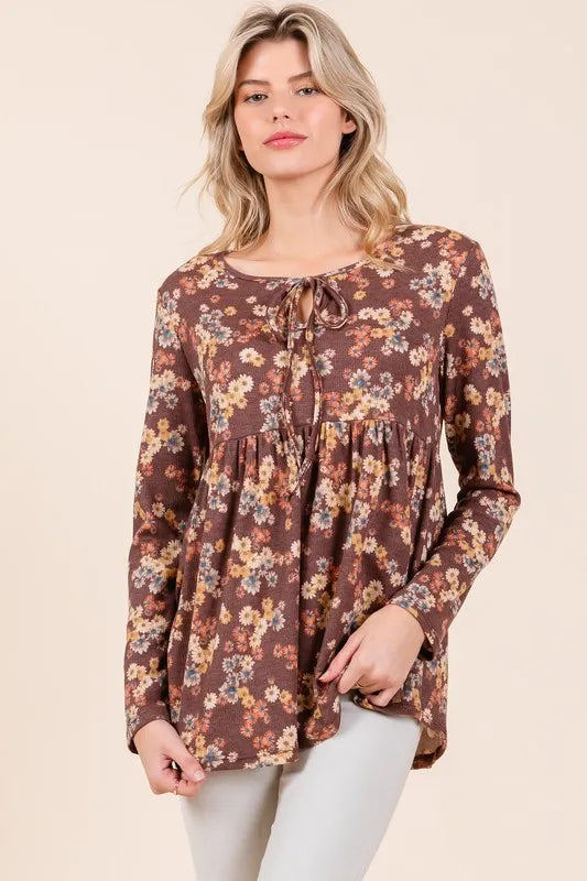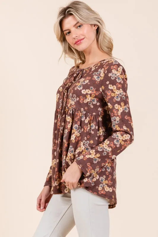 BOMBOM Floral Print Tie Neck Long Sleeve Blouse - Brown / S está agotado y se enviará tan pronto como vuelva a estar disponible.