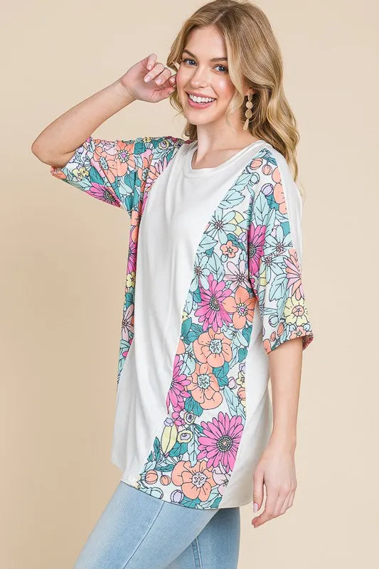 The floral round neck half sleeve t-shirt combines a feminine floral print with a classic round neckline and flattering half sleeves. This t-shirt is a versatile and stylish piece that can be dressed up or down for various occasions. The floral design adds a pop of color and charm to your outfit, making it a perfect choice for adding a touch of nature-inspired style to your wardrobe.