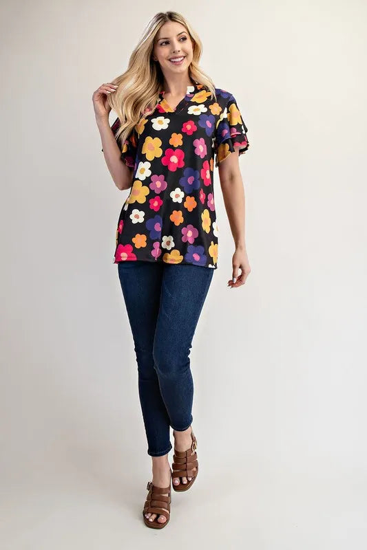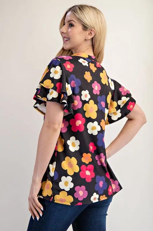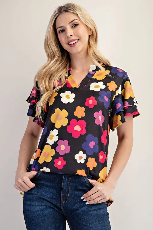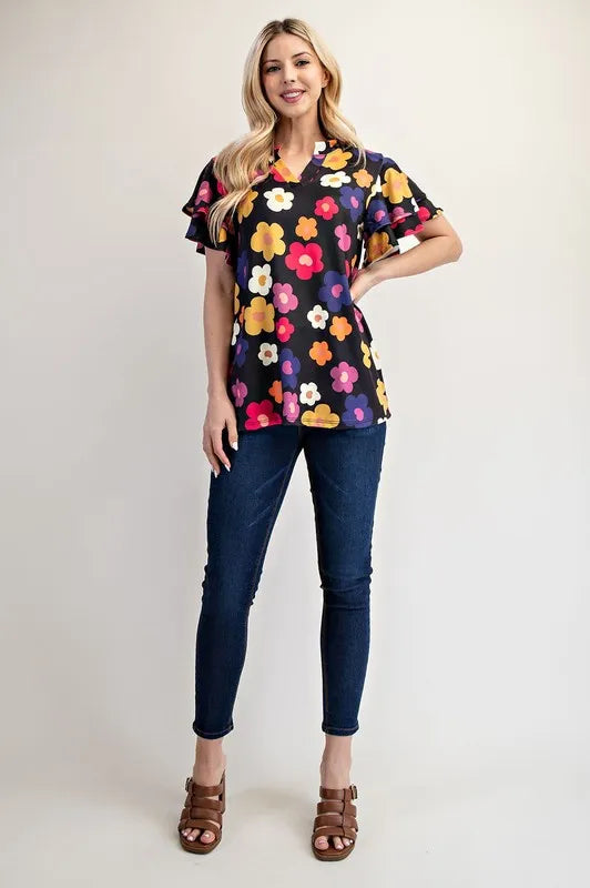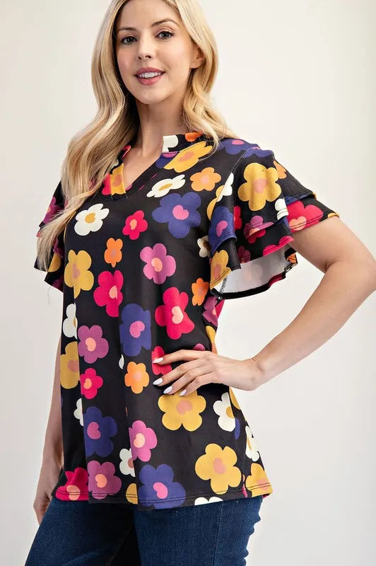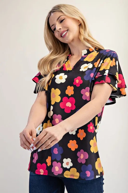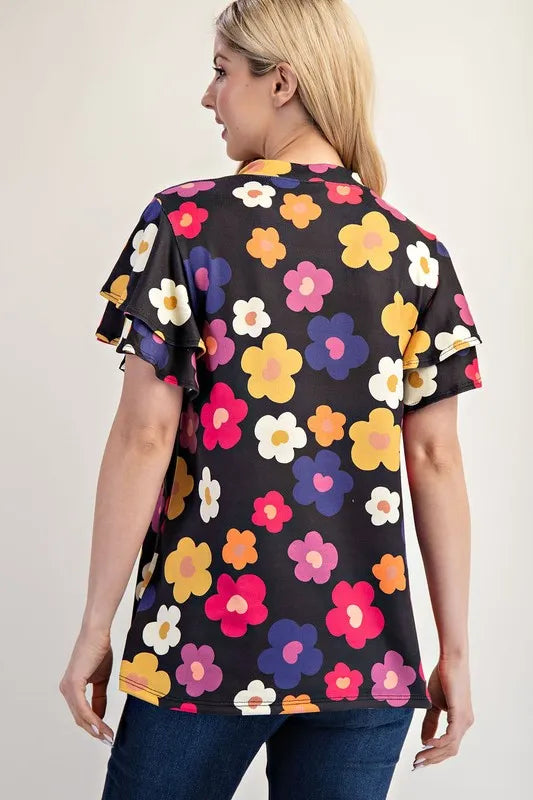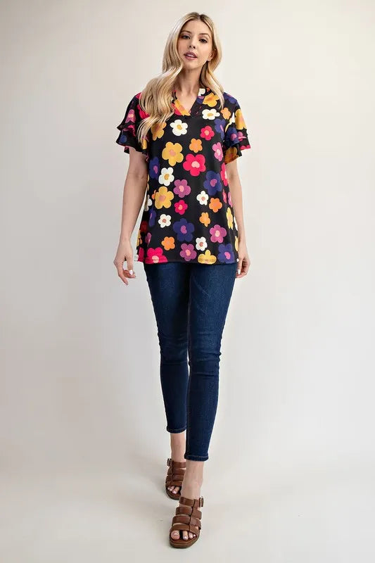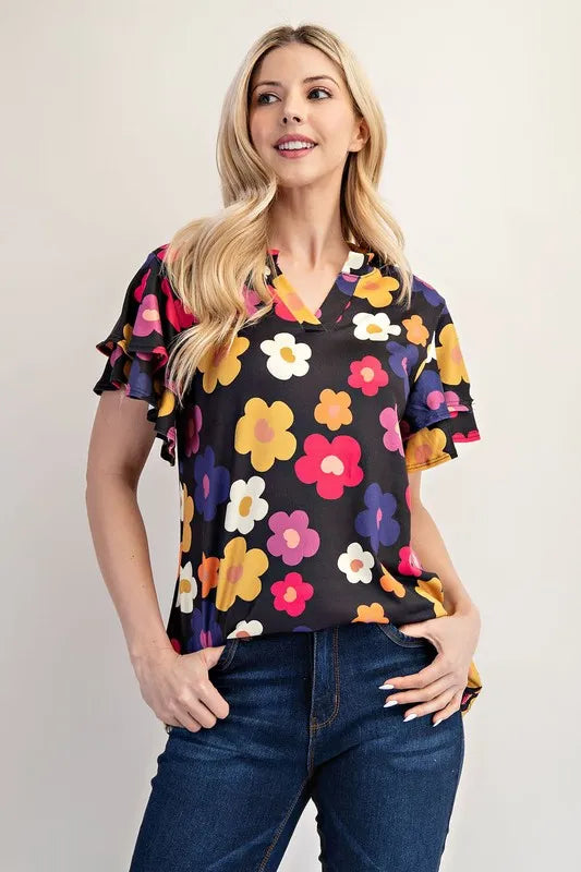 Celeste Bold Floral Ruffle Sleeve Top - BLACK FLORAL / S está agotado y se enviará tan pronto como vuelva a estar disponible.
