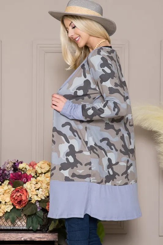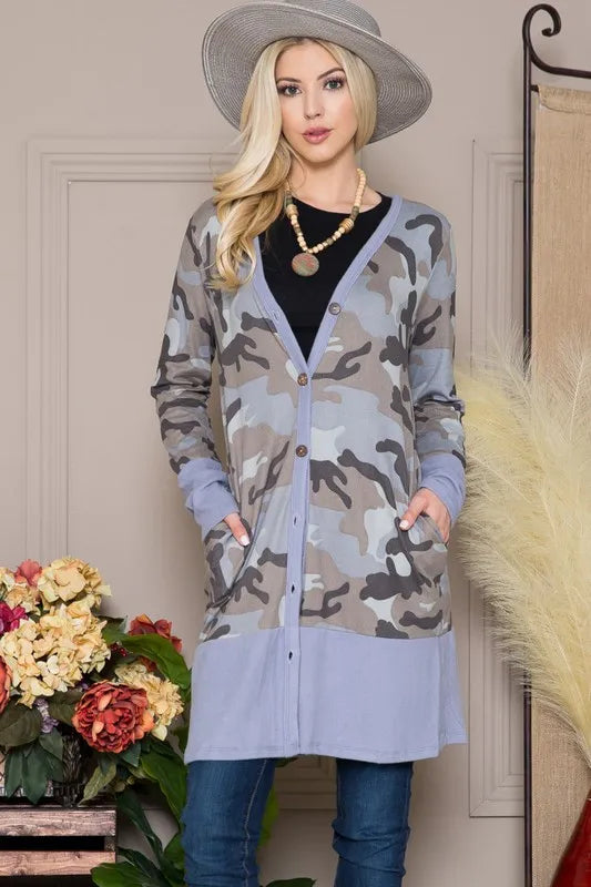 This Camouflage Button Up Long Sleeve Cardigan is a fashionable and versatile piece for your wardrobe, featuring a trendy camouflage print. The button-up design and long sleeves offer styling options for various occasions, adding a touch of edgy sophistication to your look. Elevate your outfit with this chic cardigan that combines utility-inspired style with on-trend camouflage.