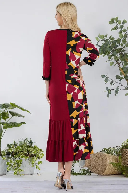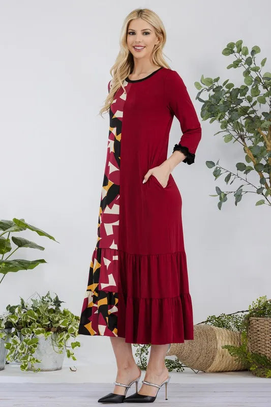 This modest midi-dress is decorated with a unique color print. This 3/4 ruffle sleeve piece is designed with a round neck, tiered ruffle skirt, and concealed side pockets. This dress is perfect for weekends, school, and summer fall transition.