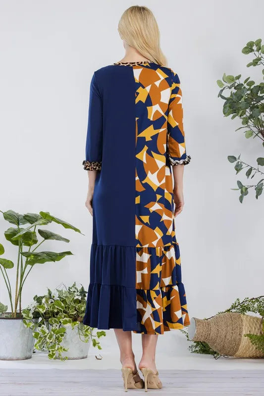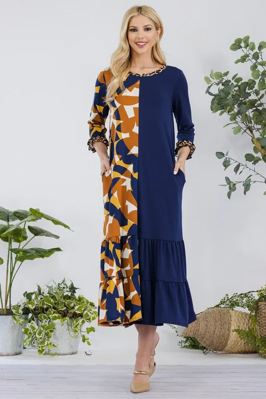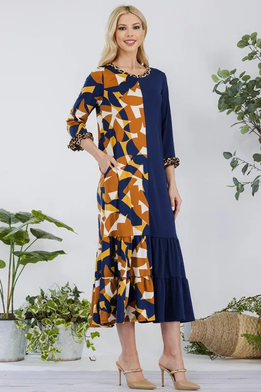 This modest midi-dress is decorated with a unique color print. This 3/4 ruffle sleeve piece is designed with a round neck, tiered ruffle skirt, and concealed side pockets. This dress is perfect for weekends, school, and summer fall transition.