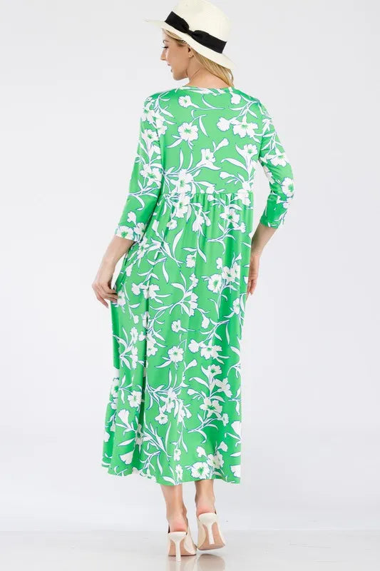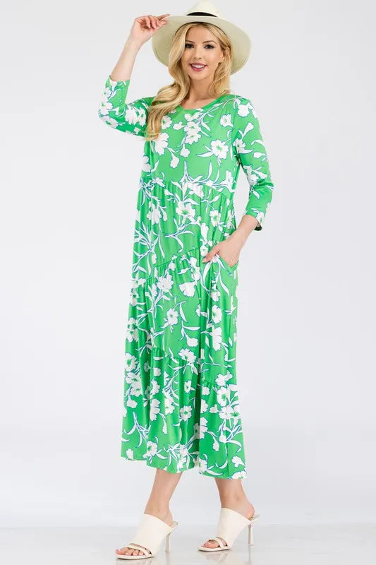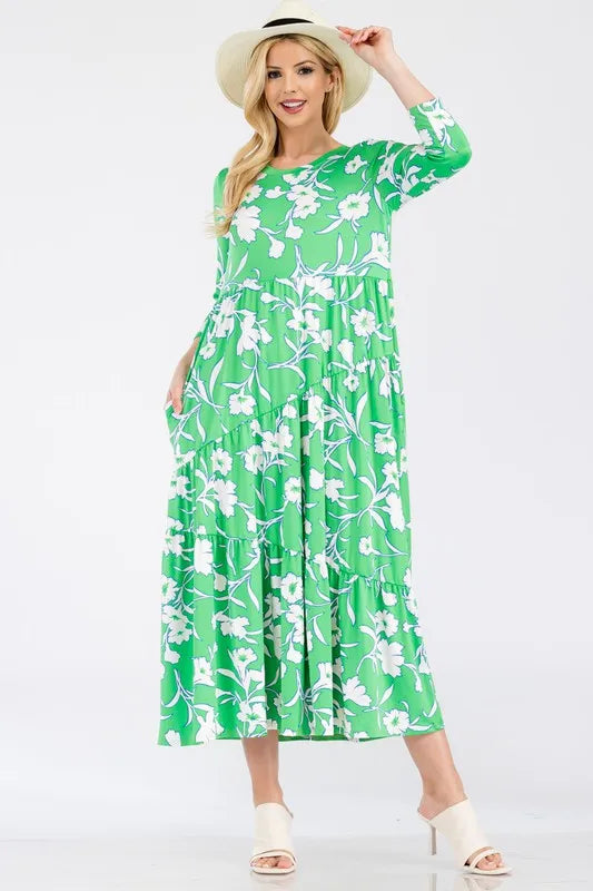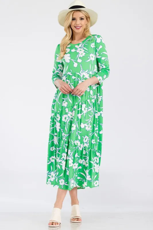 Celeste Full Size Floral Print Asymmetric Tiered Midi-Dress Plus Size - GREEN FLORAL / S está agotado y se enviará tan pronto como vuelva a estar disponible.