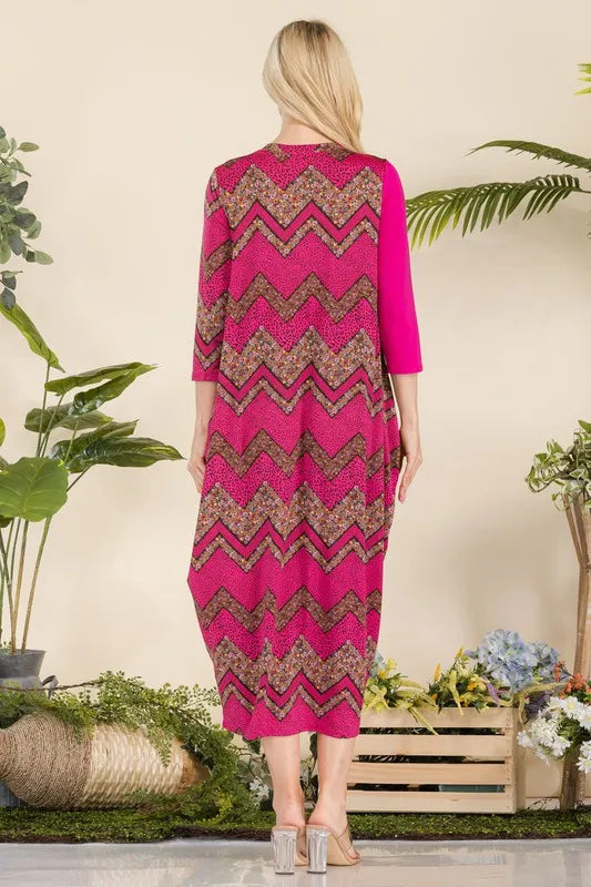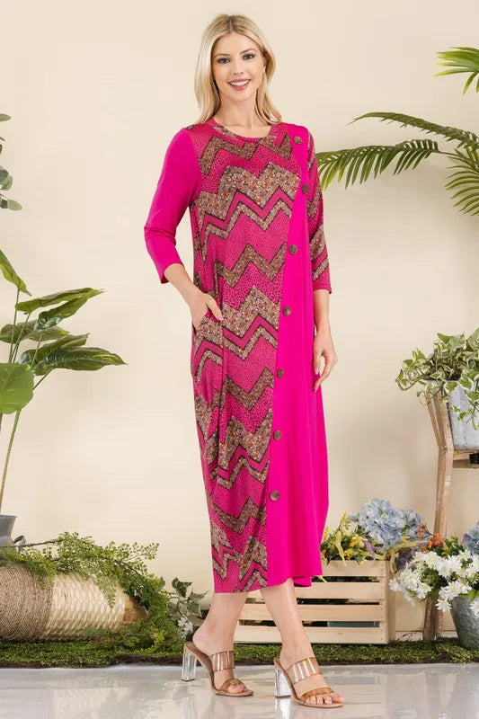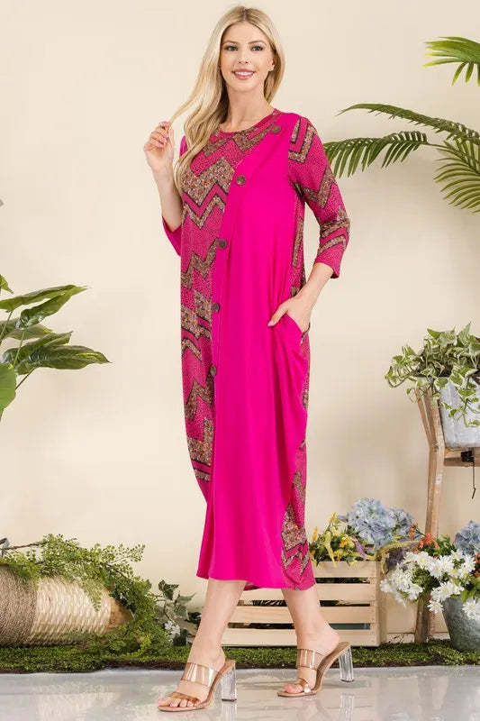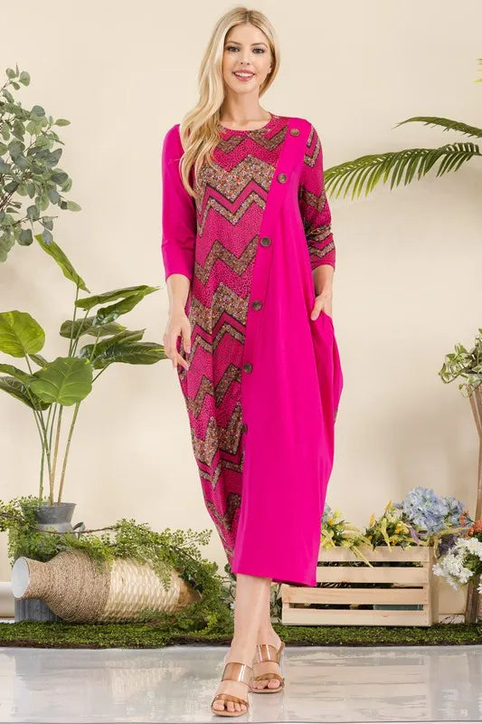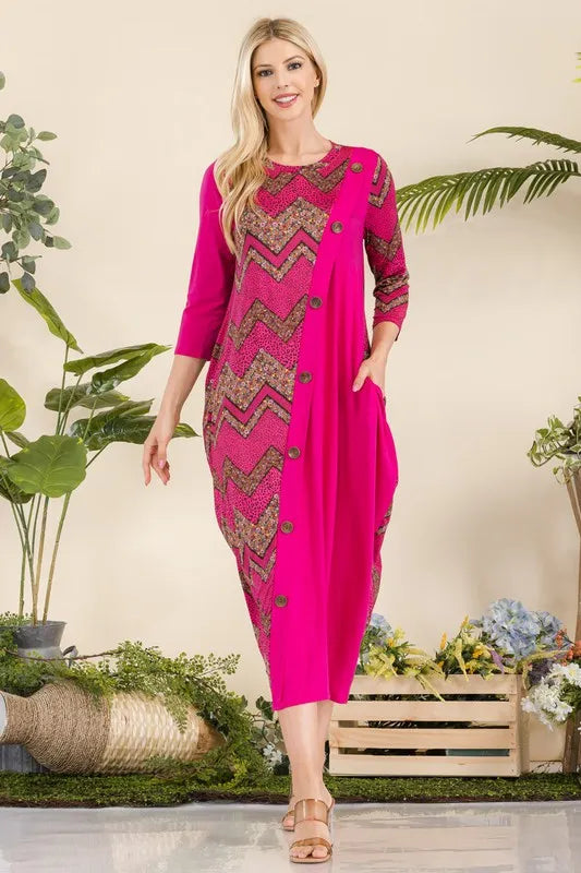Celeste Full Size Geo Print Paneled Dress with Buttons Plus Size - FUCHSIA GEOMETRIC / S está agotado y se enviará tan pronto como vuelva a estar disponible.