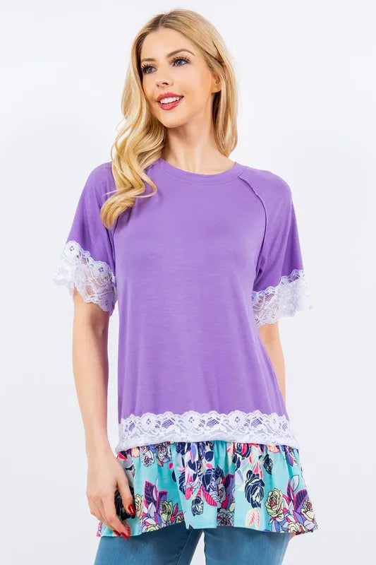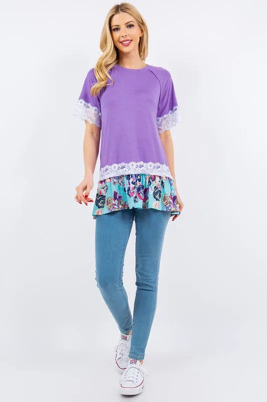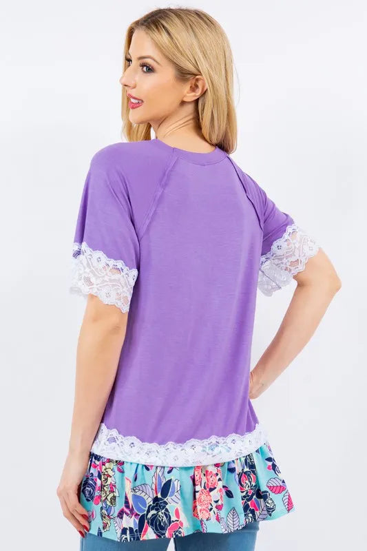 Celeste Full Size Lace Trim Short Sleeve Top Plus Size - LILAC FLORAL / S está agotado y se enviará tan pronto como vuelva a estar disponible.