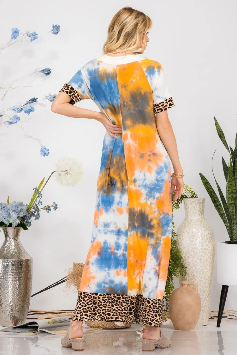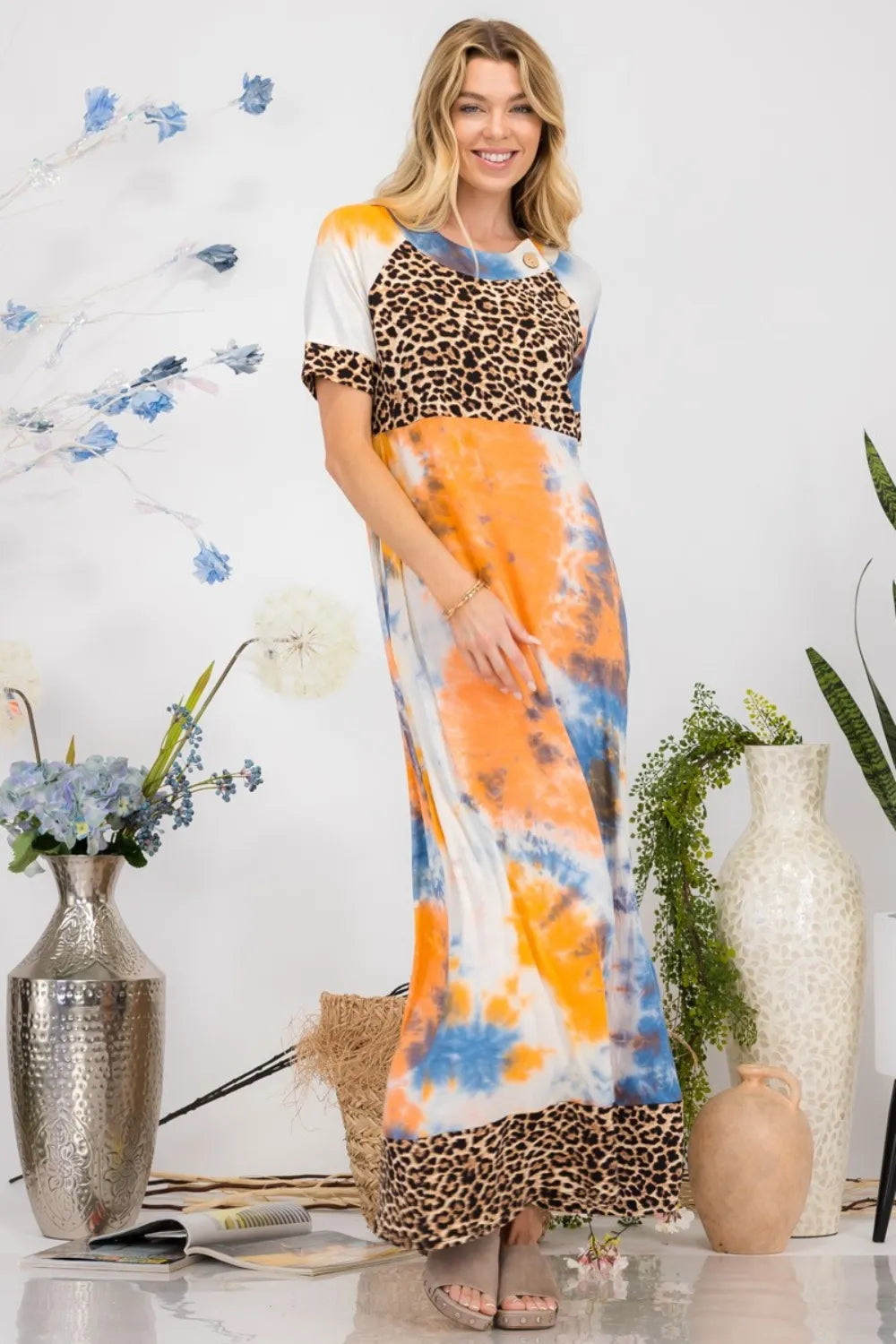 Celeste Full Size Leopard Tie-Dye Button Detail Short Sleeve Maxi Dress Plus Size