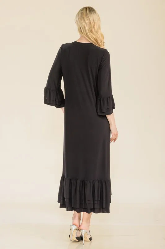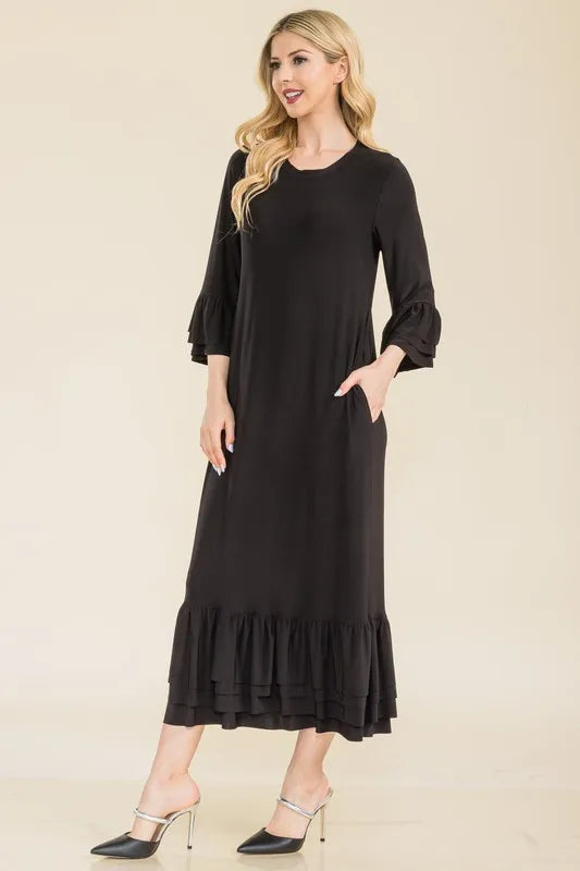 Celeste Full Size Modest Midi Dress with 3/4 Ruffle Bell Sleeves Plus Size - BLACK / S está agotado y se enviará tan pronto como vuelva a estar disponible.