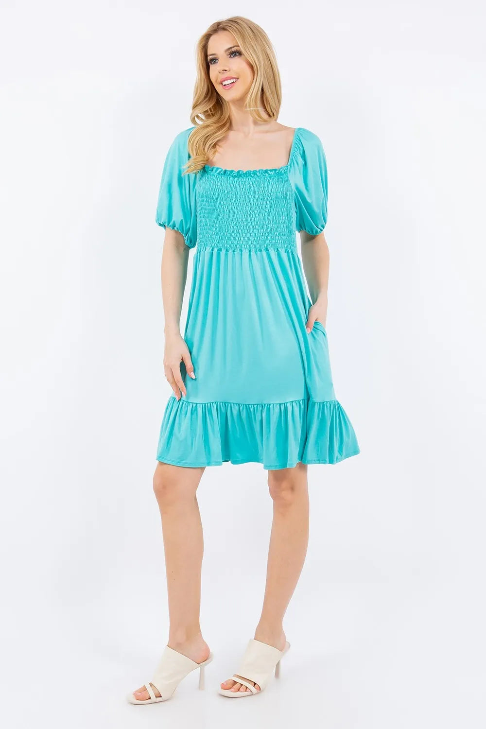 Celeste Full Size Smocked Square Neck Puff Sleeve Ruffle Hem Dress Plus Size - Mint / XL está agotado y se enviará tan pronto como vuelva a estar disponible.
