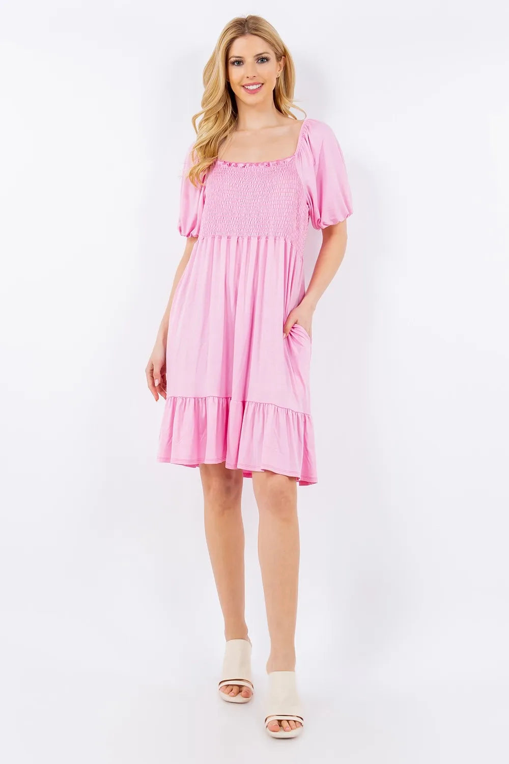 The Ruffle Hem Short Sleeve Smocked Dress is a charming and feminine piece that features a flattering smocked bodice and a delicate ruffle hem. This dress is perfect for a sweet and romantic look, with the smocked detailing providing a comfortable and form-fitting silhouette. The ruffle hem adds a flirty and playful touch, creating movement and dimension to the dress. The short sleeves offer a versatile and easy-to-wear option for warmer days. Whether you're headed to a casual outing or a special event, the Ruffle Hem Short Sleeve Smocked Dress is a versatile and stylish choice that will make you feel pretty and confident.