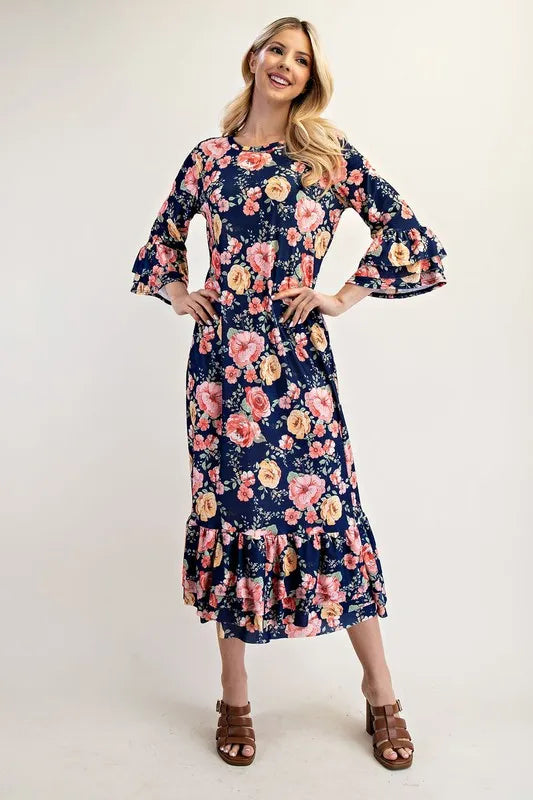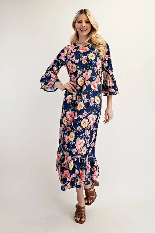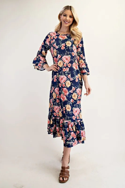 Celeste Full Size Soft Floral Ruffle Trim Dress Plus Size