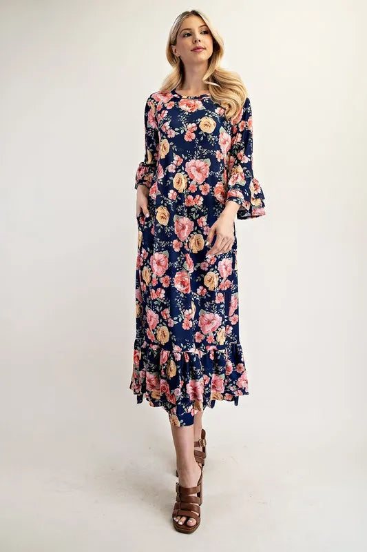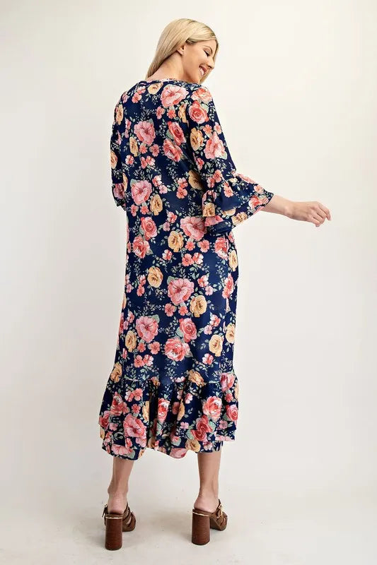 Celeste Full Size Soft Floral Ruffle Trim Dress Plus Size - NAVY FLORAL / S está agotado y se enviará tan pronto como vuelva a estar disponible.