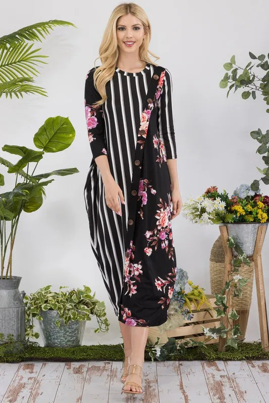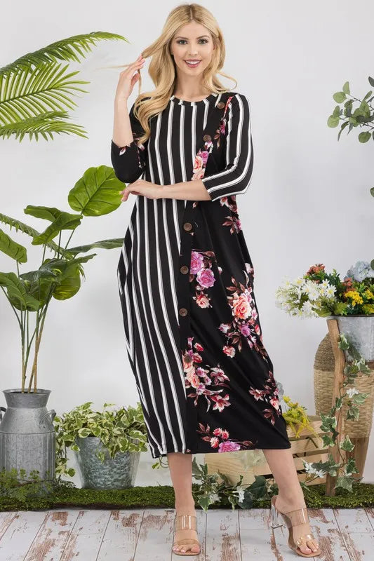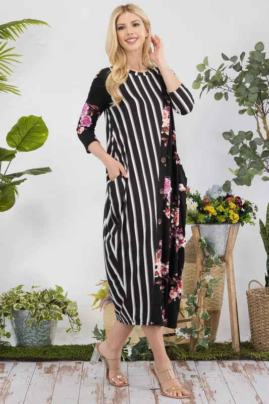 Celeste Full Size Stripe Floral Contrast Midi-Dress with Buttons Plus Size - BLACK FLORAL/STRIPE / S está agotado y se enviará tan pronto como vuelva a estar disponible.
