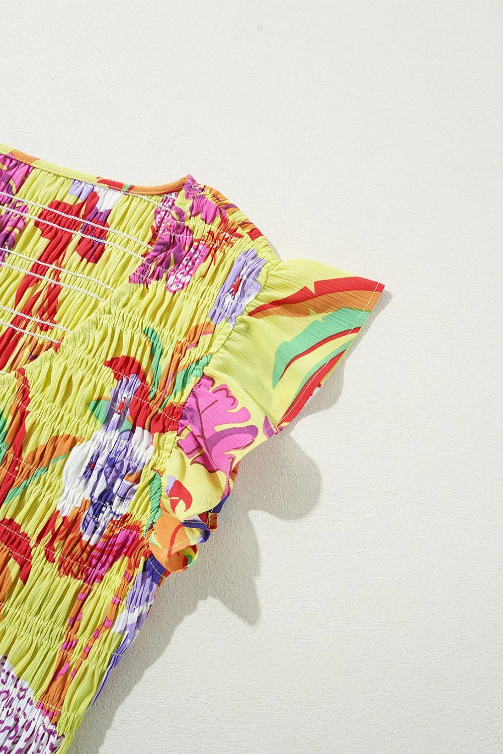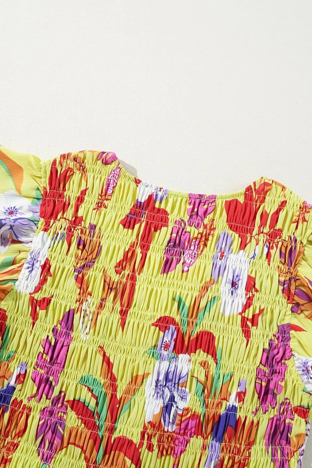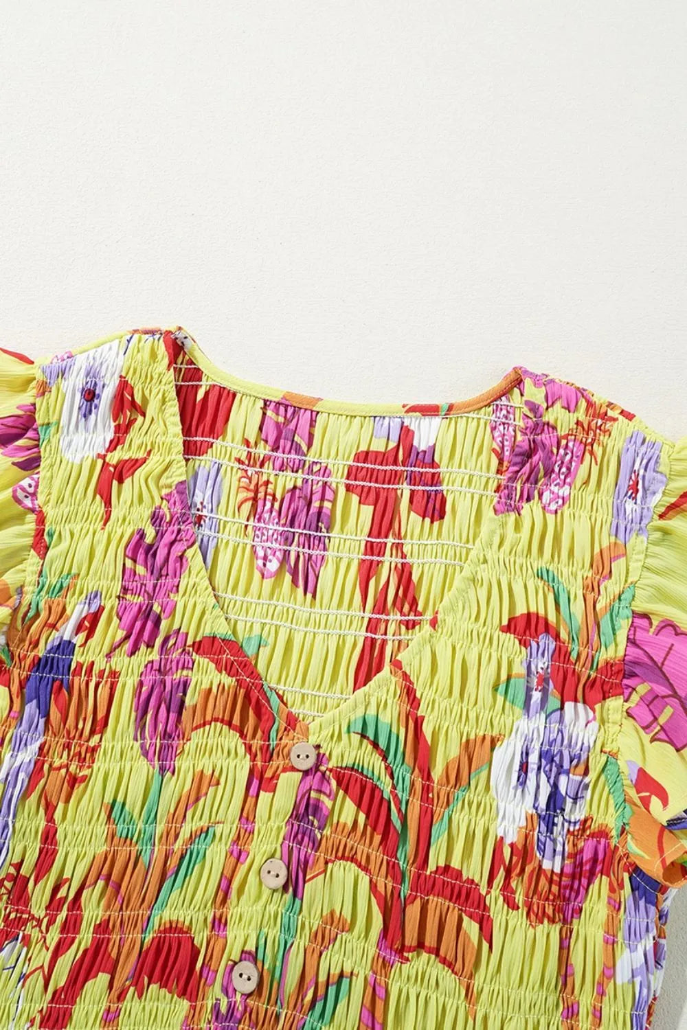 Cheetah Plant Print Shirred Button V Neck Maxi Dress - Yellow / S está agotado y se enviará tan pronto como vuelva a estar disponible.