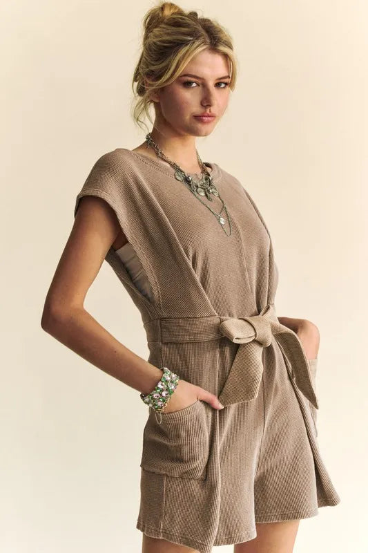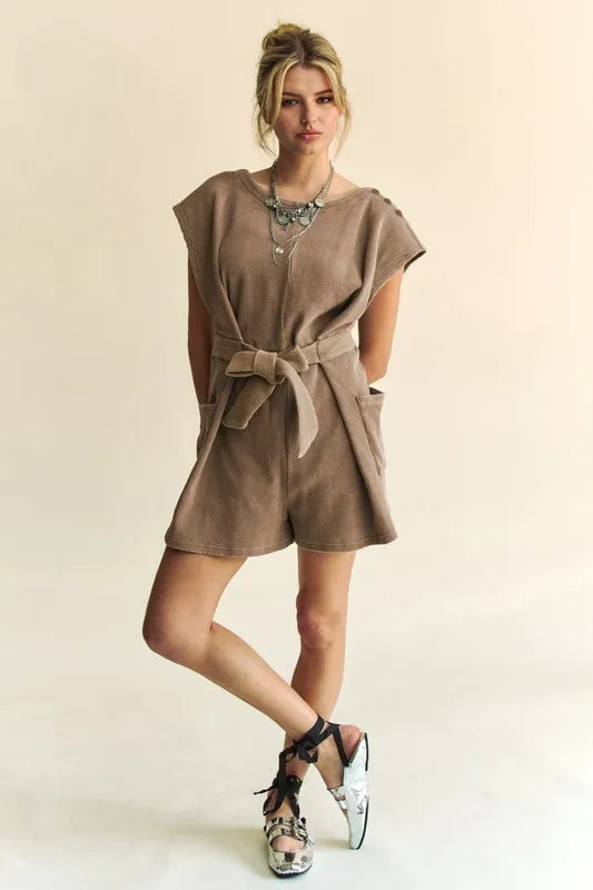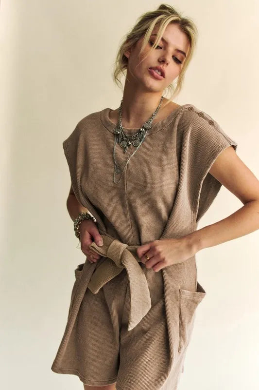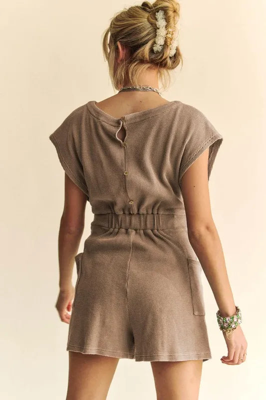 Davi & Dani Acid-Washed Waffle Knit Cuffed Sleeves Romper - Mocha / S está agotado y se enviará tan pronto como vuelva a estar disponible.