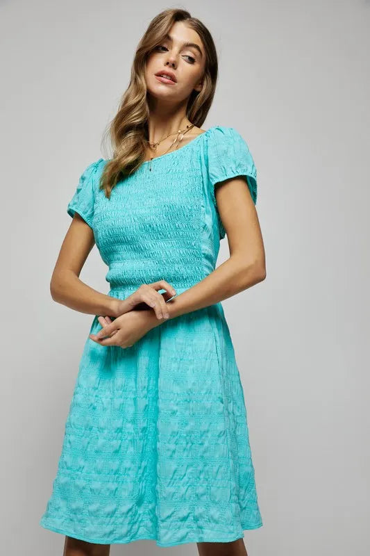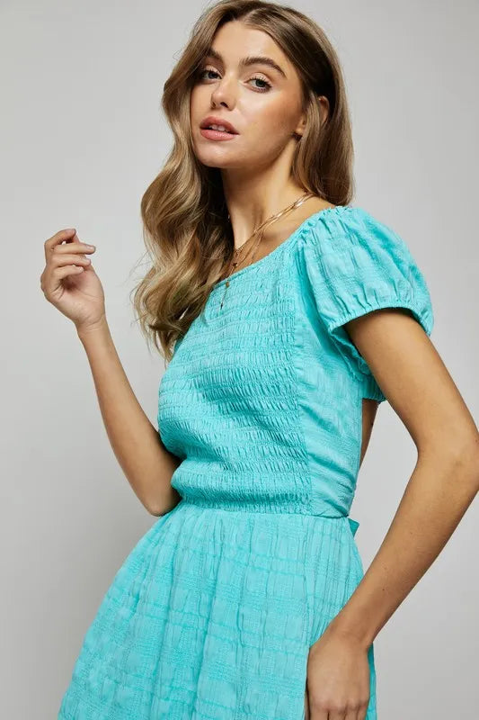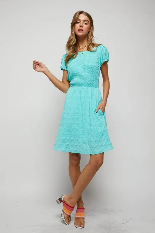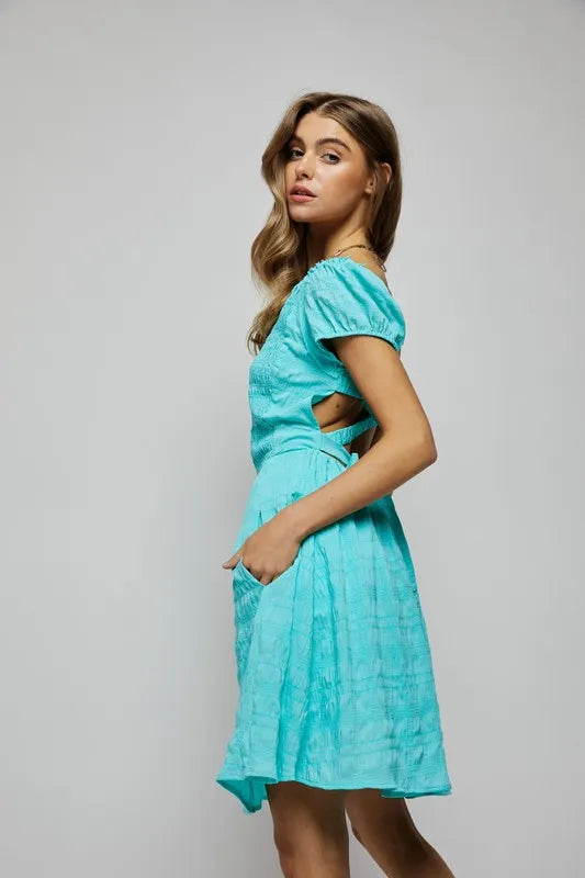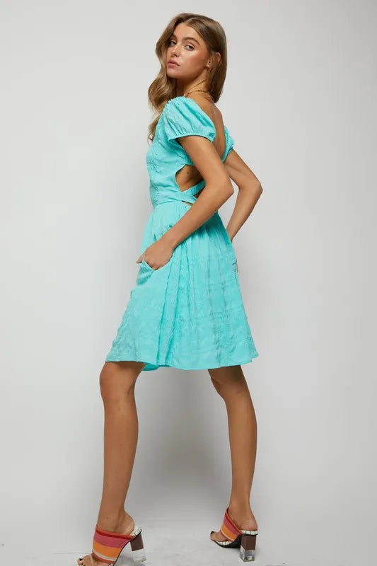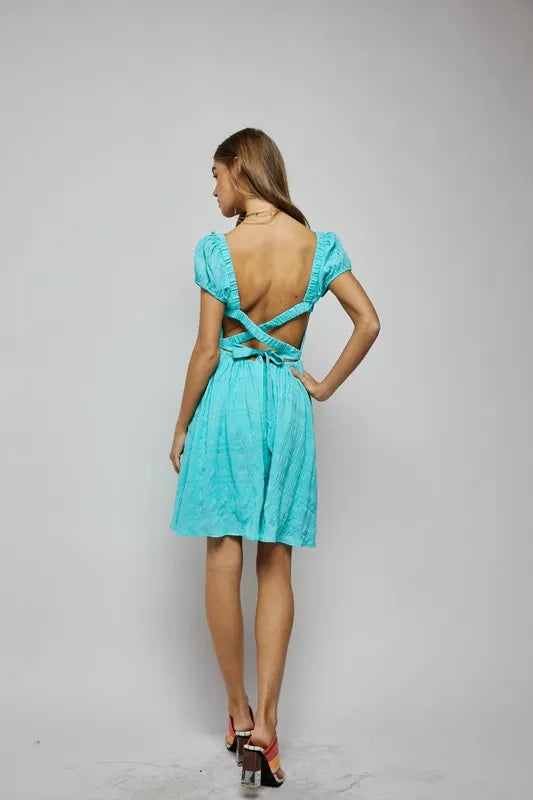 Davi & Dani Crossed Back Short Sleeve Dress with Pockets - Aqua Blue / S está agotado y se enviará tan pronto como vuelva a estar disponible.