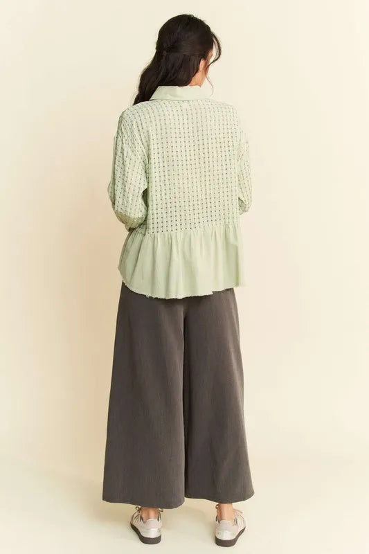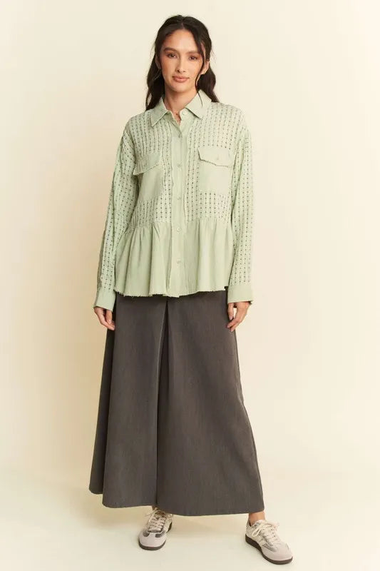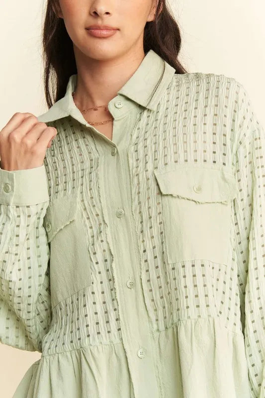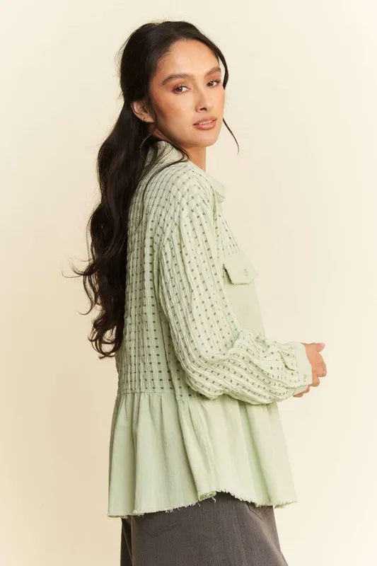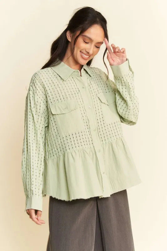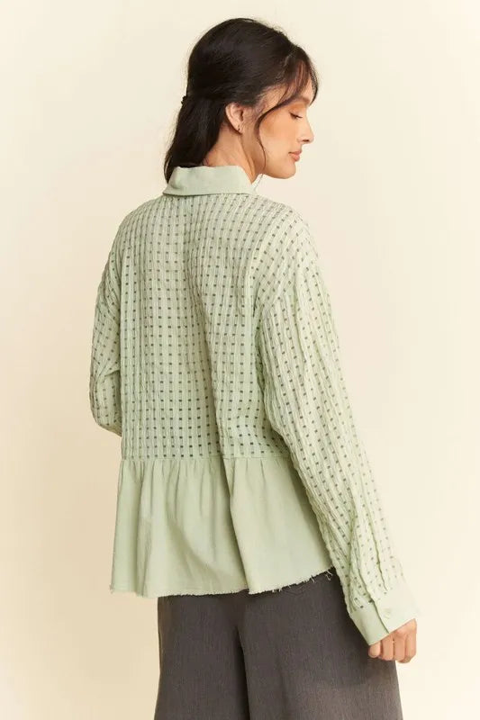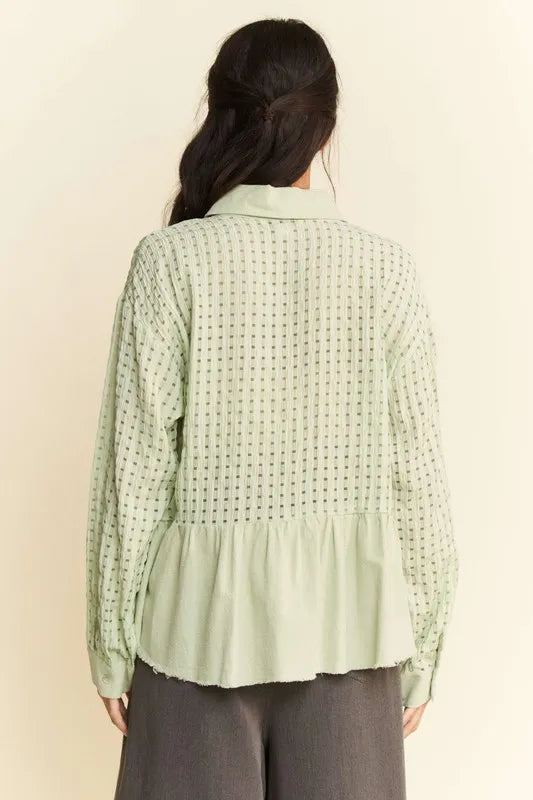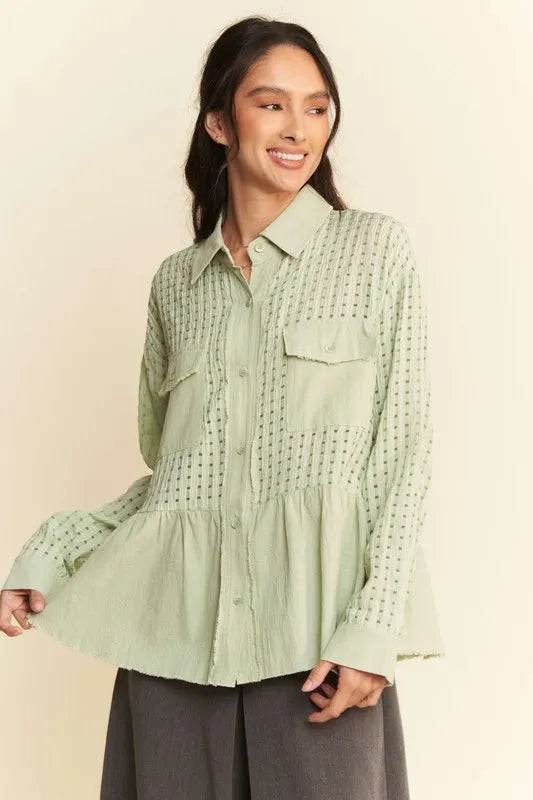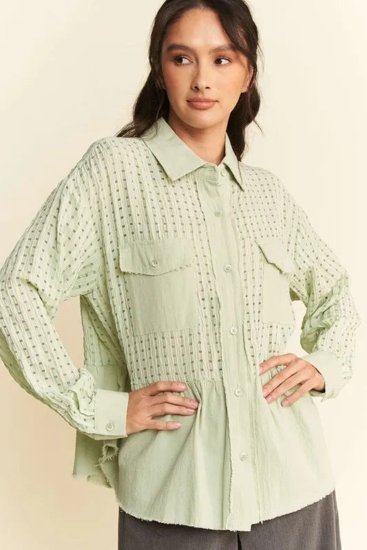 Davi & Dani Garment Washed Jacquard Button Front Shirt - Sage / S está agotado y se enviará tan pronto como vuelva a estar disponible.