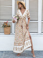 Drawstring Printed Plunge Half Sleeve Dress - Khaki / S está agotado y se enviará tan pronto como vuelva a estar disponible.