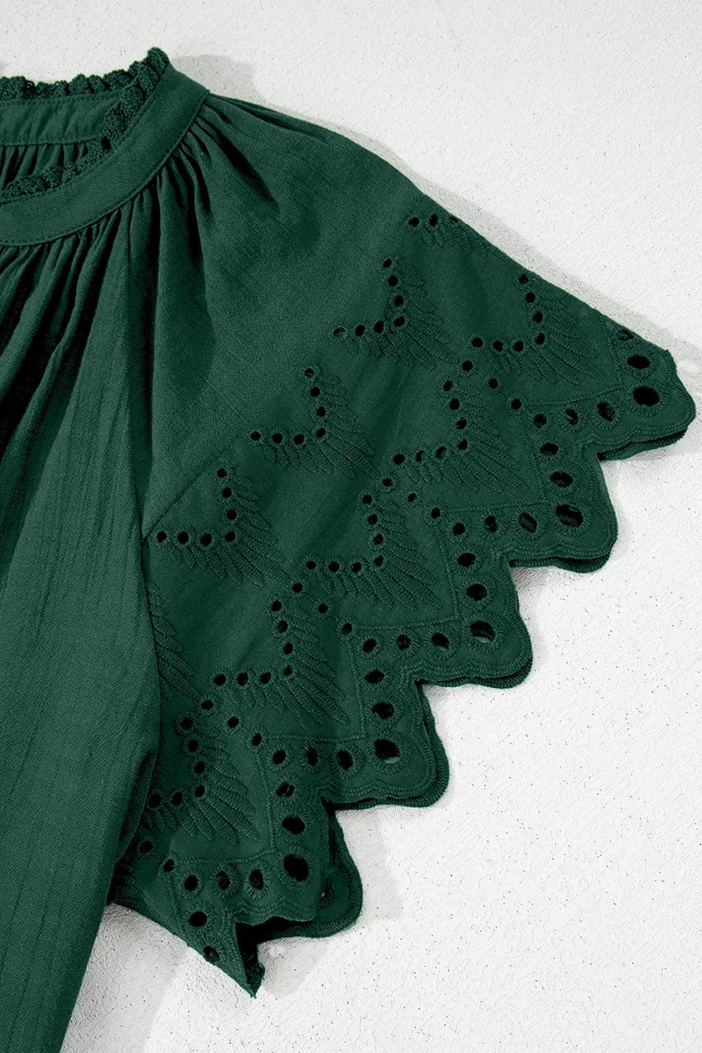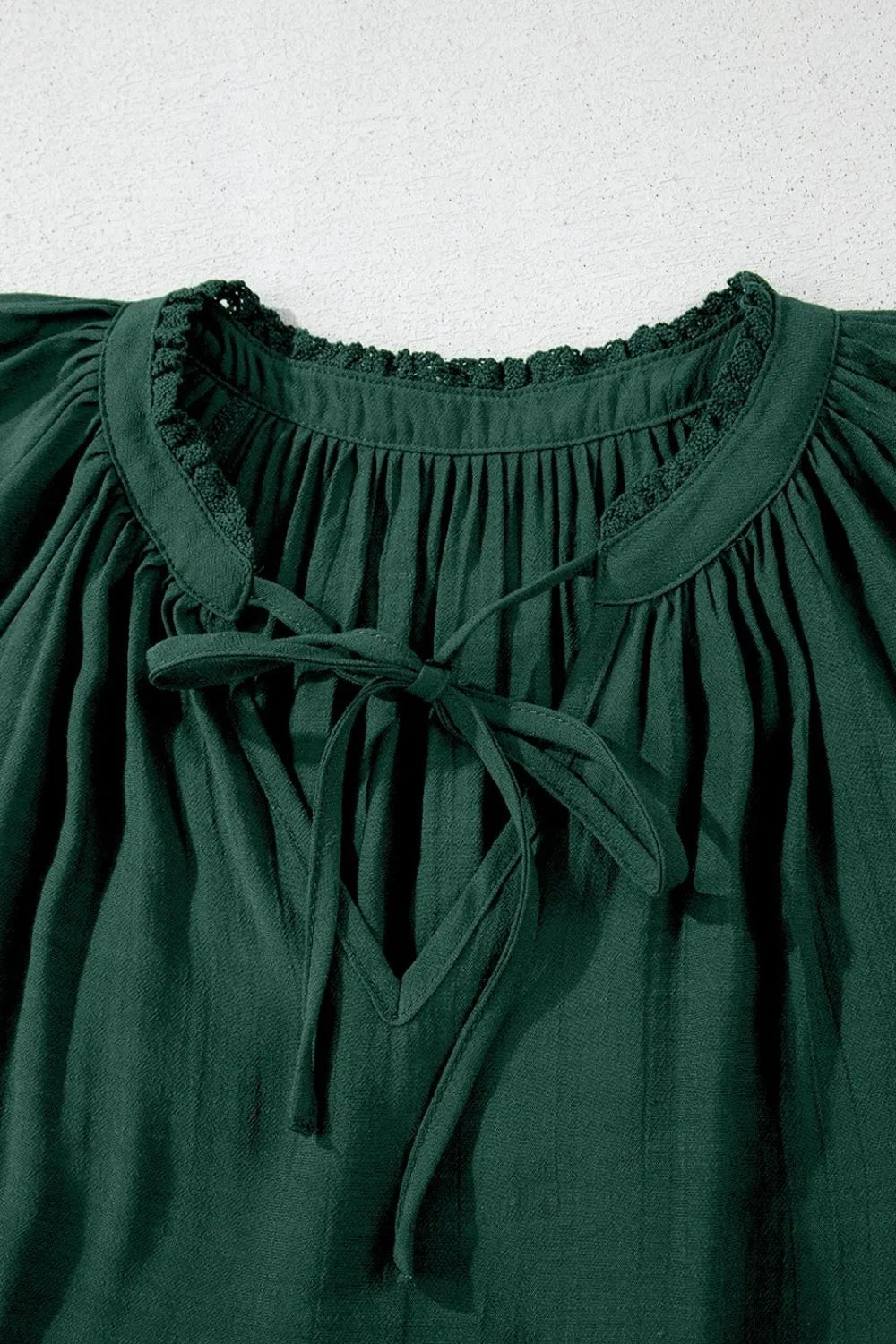 Eyelet Embroidered Sleeve Tie Neck Blouse - Dark Green / S está agotado y se enviará tan pronto como vuelva a estar disponible.