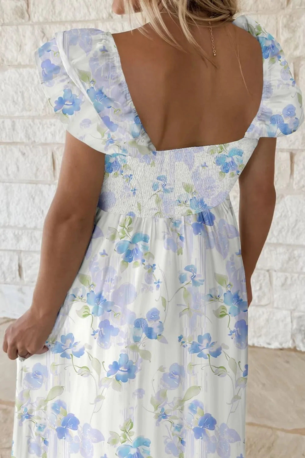 Floral Smocked High Waist Double Ruffle Sleeveless Long Dress