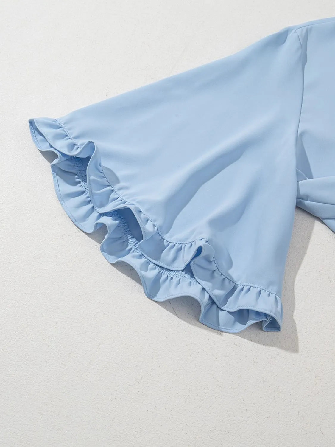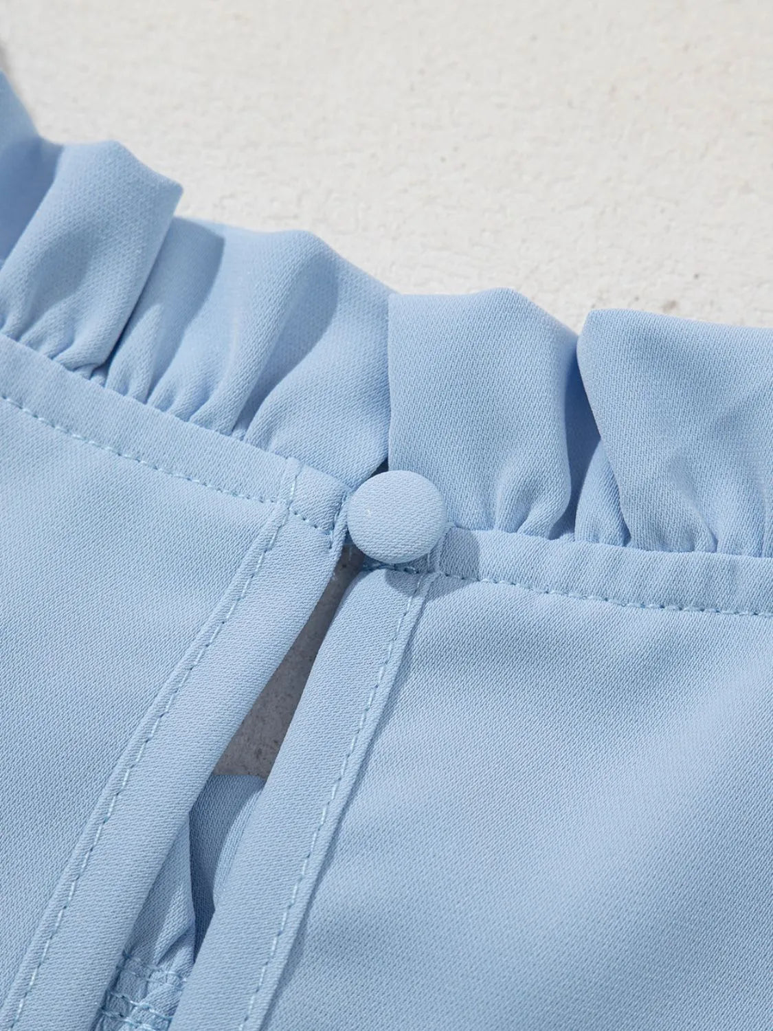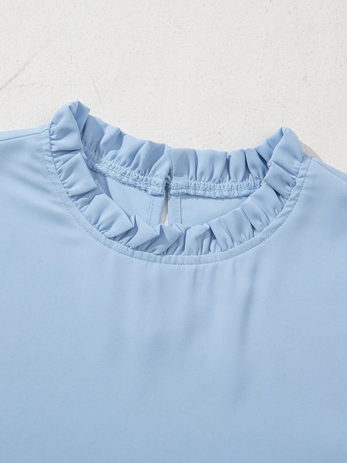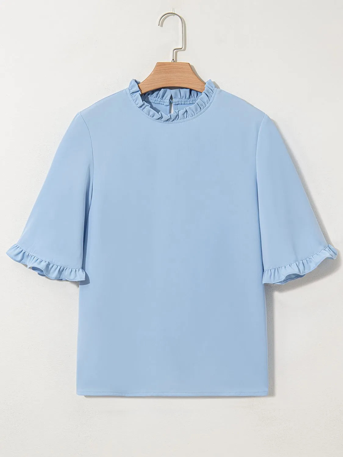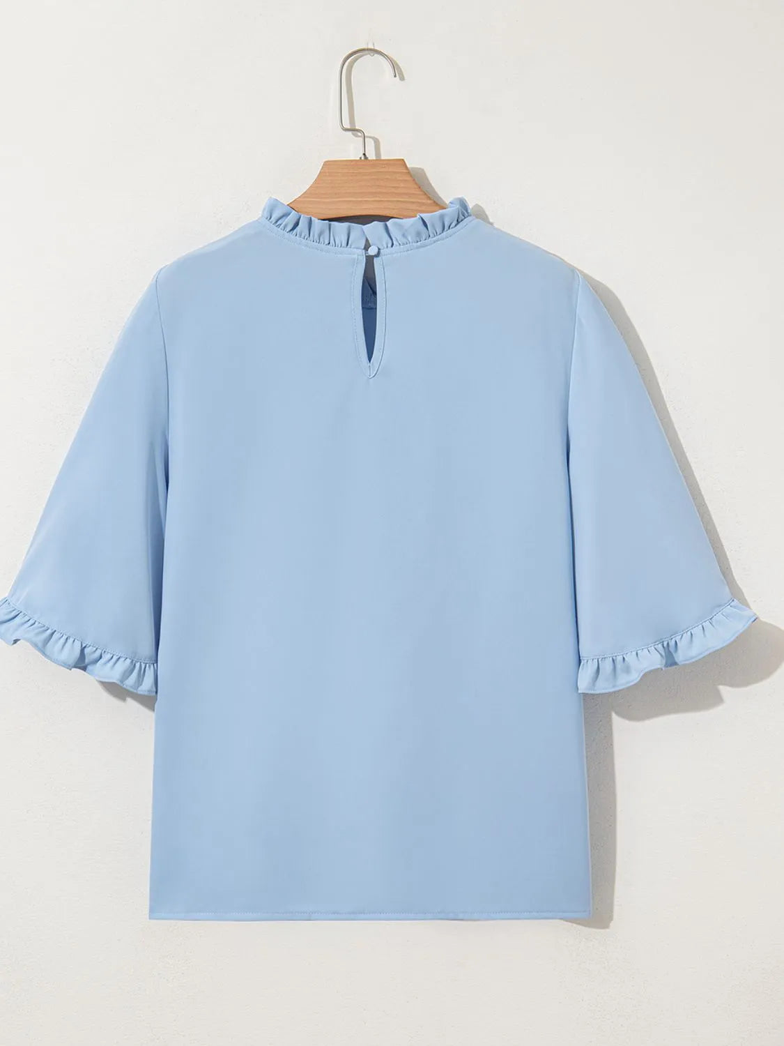 Frill Solid Round Neck Half Sleeve Blouse - Light Blue / S está agotado y se enviará tan pronto como vuelva a estar disponible.