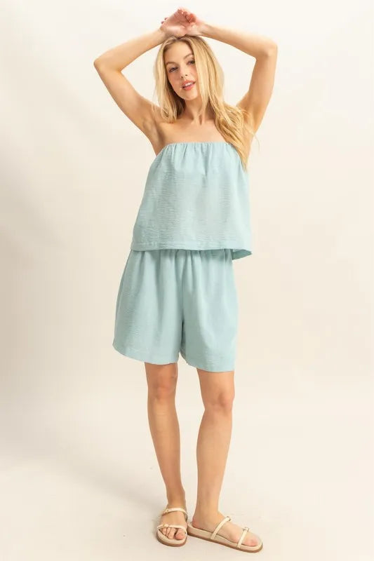 The tube top and flowy shorts set is a chic and coordinated outfit option. The tube top offers a stylish and summery look, while the flowy shorts provide comfort and movement. This set is perfect for a casual and effortless ensemble that is also on-trend and versatile for various occasions.