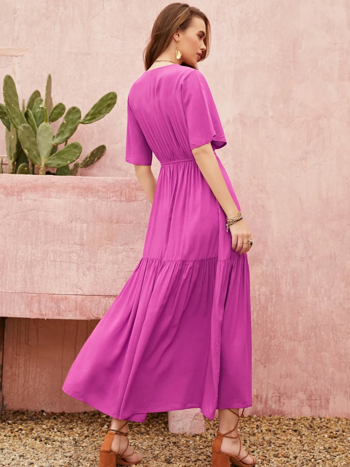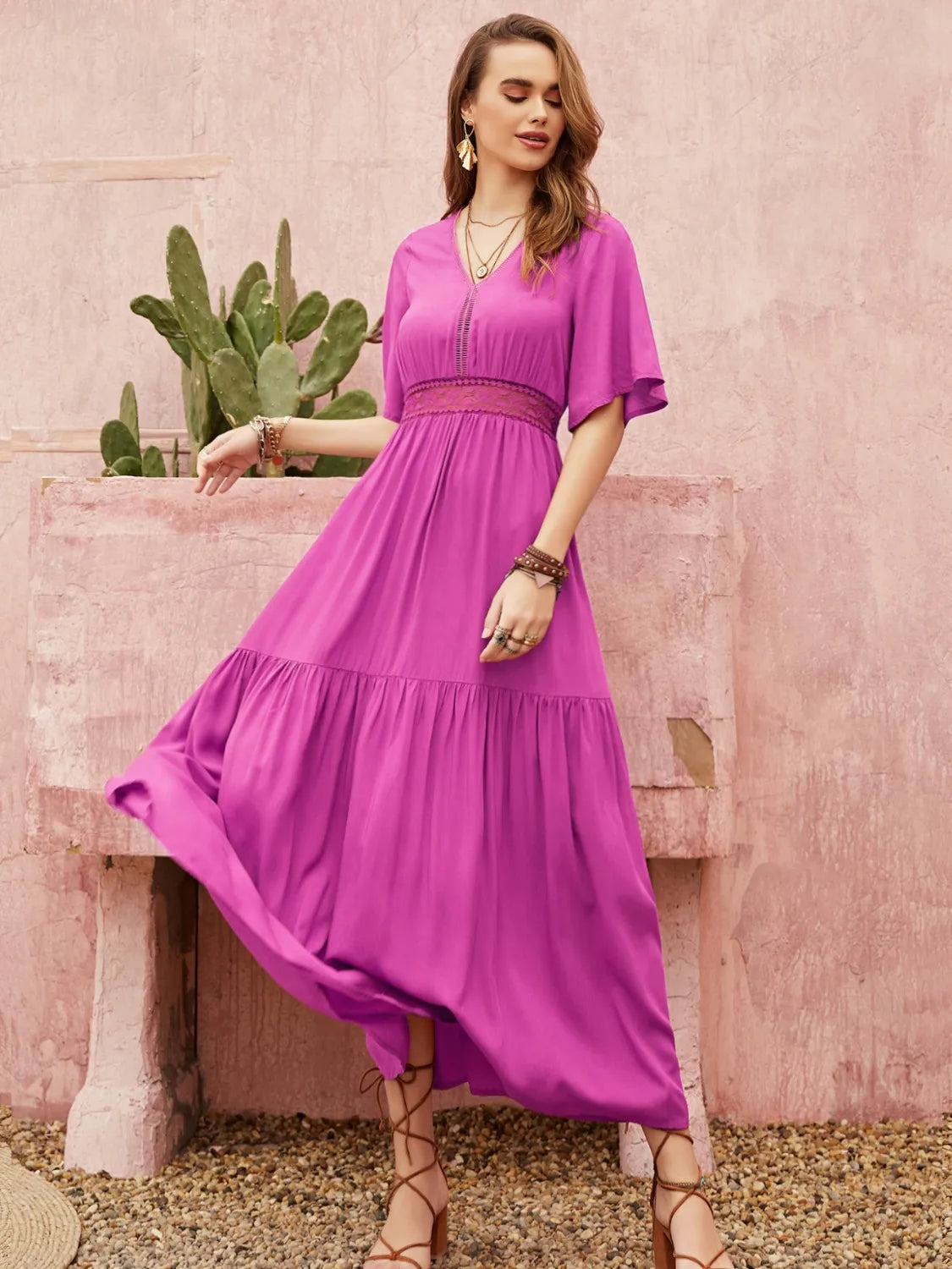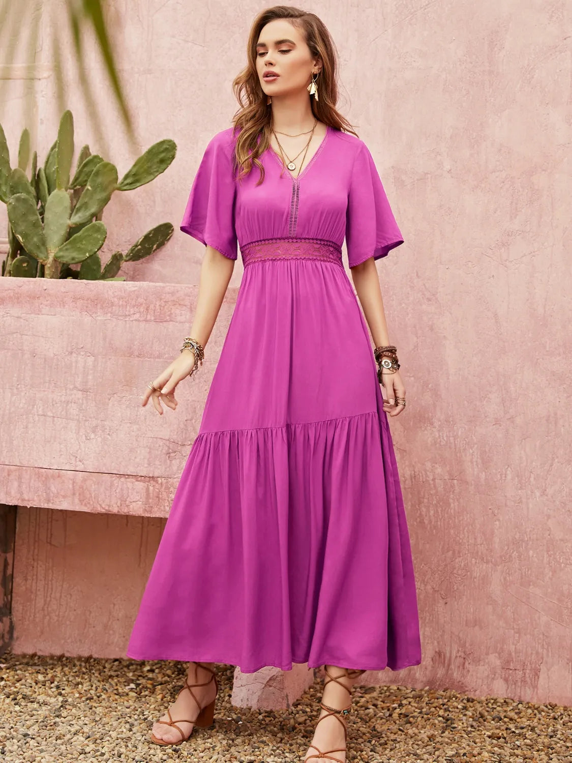 Lace Detail V-Neck Short Sleeve Midi Dress - Red-Violet / S está agotado y se enviará tan pronto como vuelva a estar disponible.