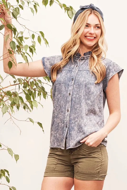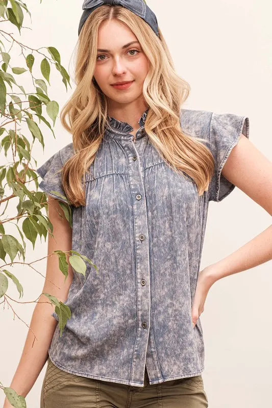 Achieve a casual and effortlessly stylish look with this mineral wash flutter sleeve button-down shirt. The mineral wash gives the shirt a relaxed and lived-in vibe, while the flutter sleeves add a feminine and playful touch. The button-down design offers a versatile and classic look that can be dressed up or down. Pair it with your favorite jeans or shorts for a chic and laid-back ensemble. Embrace a trendy and comfortable style with this versatile shirt.