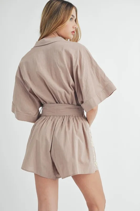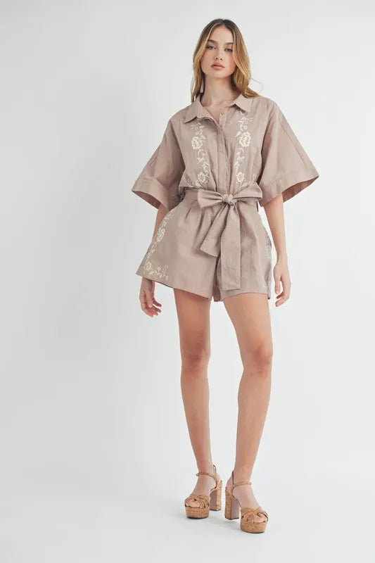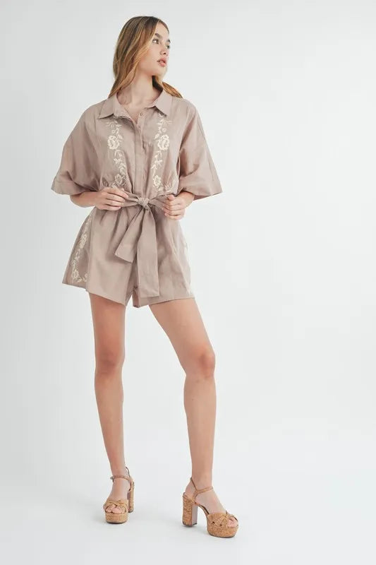 MABLE Embroidered Button Down Collared Neck Romper - Lt Mocha / L está agotado y se enviará tan pronto como vuelva a estar disponible.